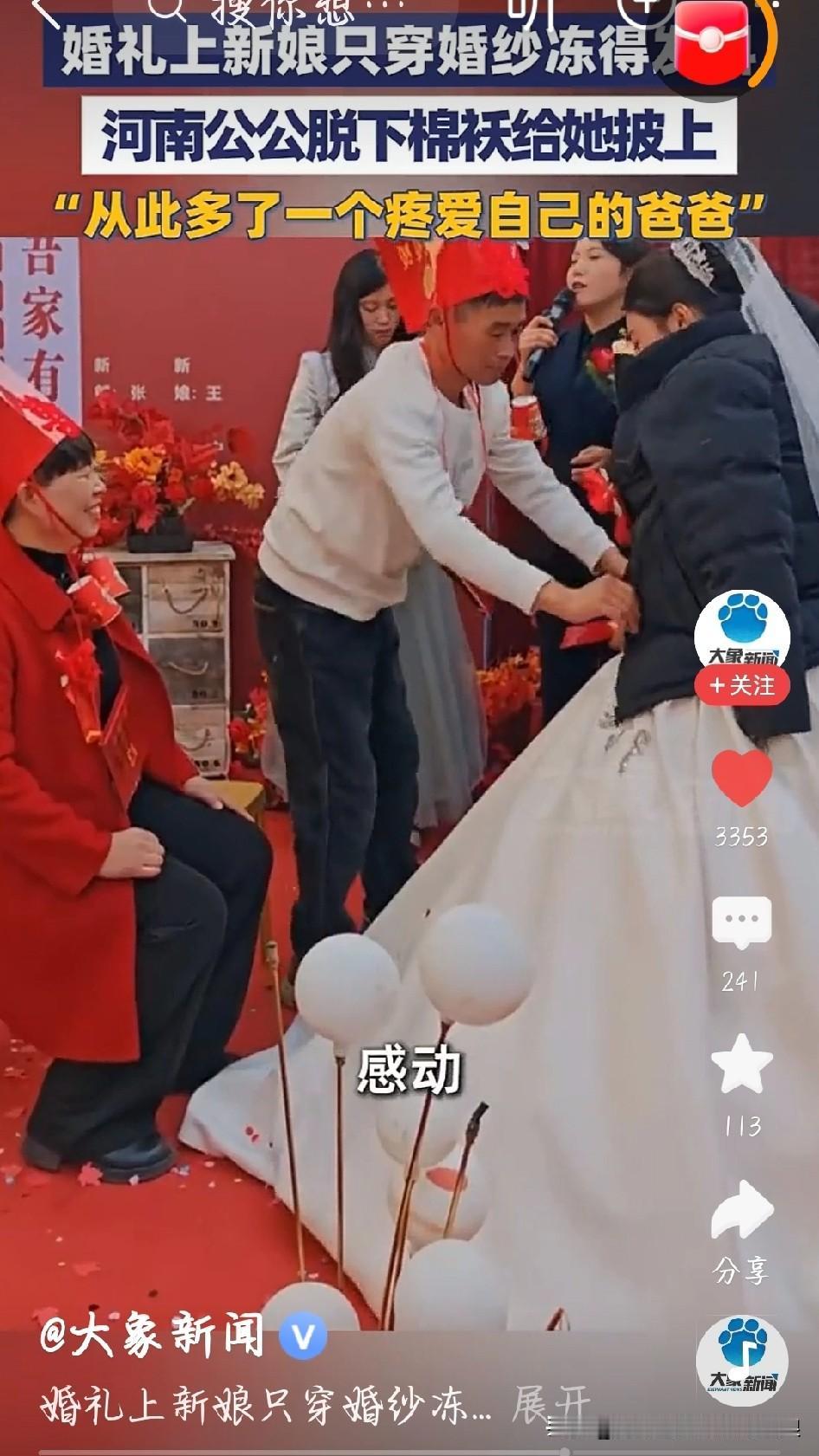 河南周口这场寒冬婚礼太暖了!零下几度的天,新娘穿单薄婚纱敬茶,冻得浑身发抖、嘴唇发紫,新郎忙着应酬没察觉,公公的举动却戳中全网。 他二话不说脱下自己的厚棉袄,快步上前给新娘披上,还细心拢了拢领口,只说“我扛冻,你别落下病根”。自己穿着单毛衣坐寒风里,目光却一直盯着儿媳,满脸欣慰。 这哪是一件棉袄啊,是把儿媳当亲闺女疼的真心!比千万彩礼都金贵,比华丽仪式都动人。 现在很多婚礼比排场比彩礼,却忘了日子过得是人心。这位公公用最朴实的动作证明:好婆家从不是靠钱撑场面,而是真心实意疼晚辈。这样的家风,日子能差吗?新娘冻得发抖 公公脱下棉袄给她披上