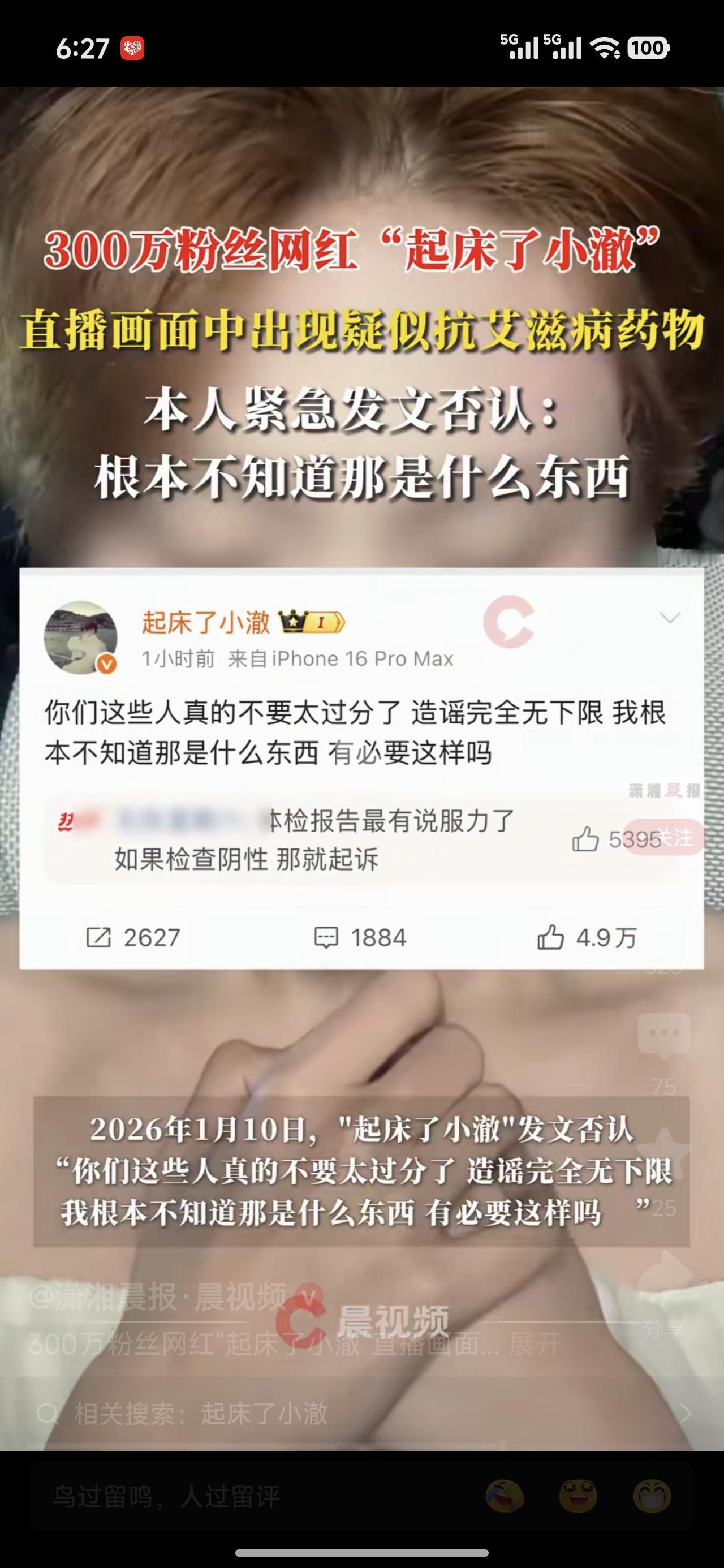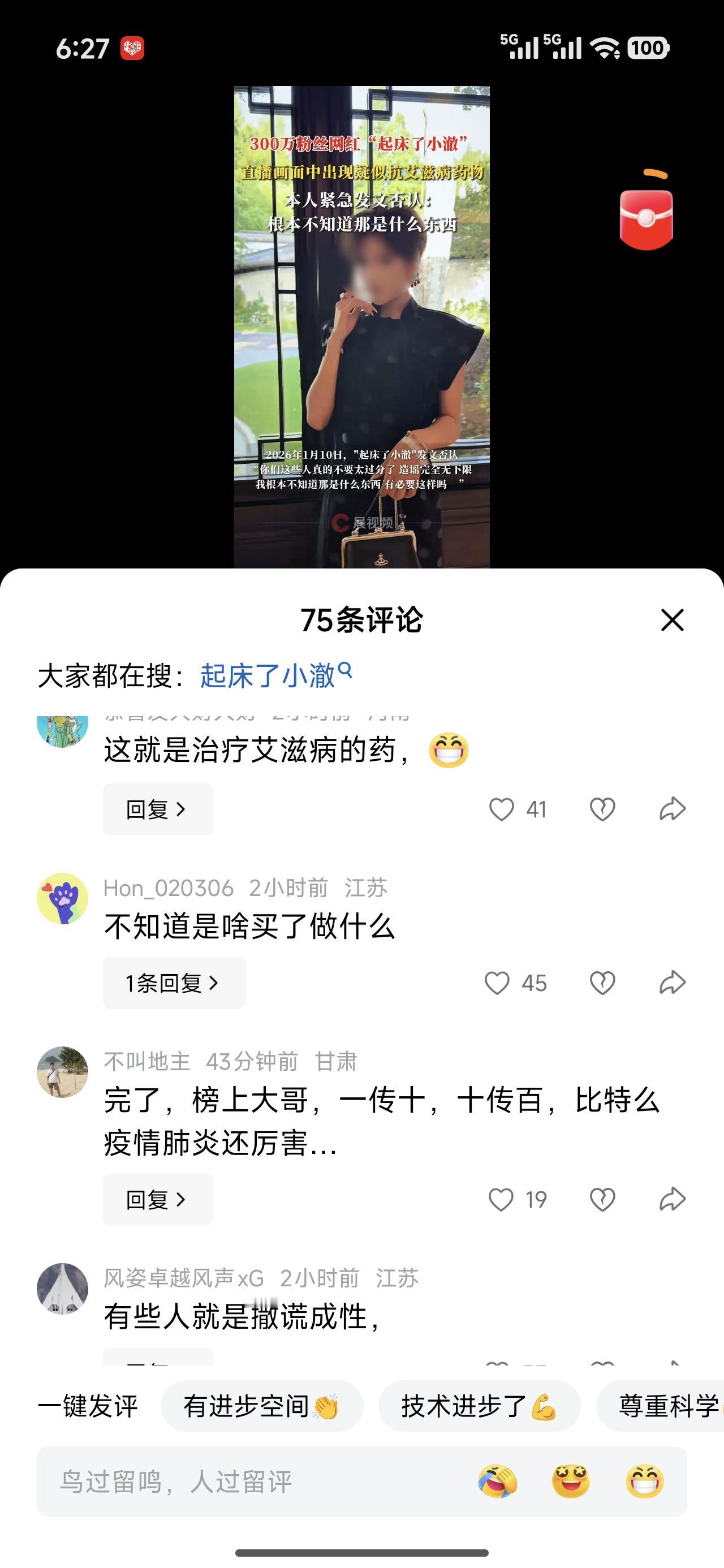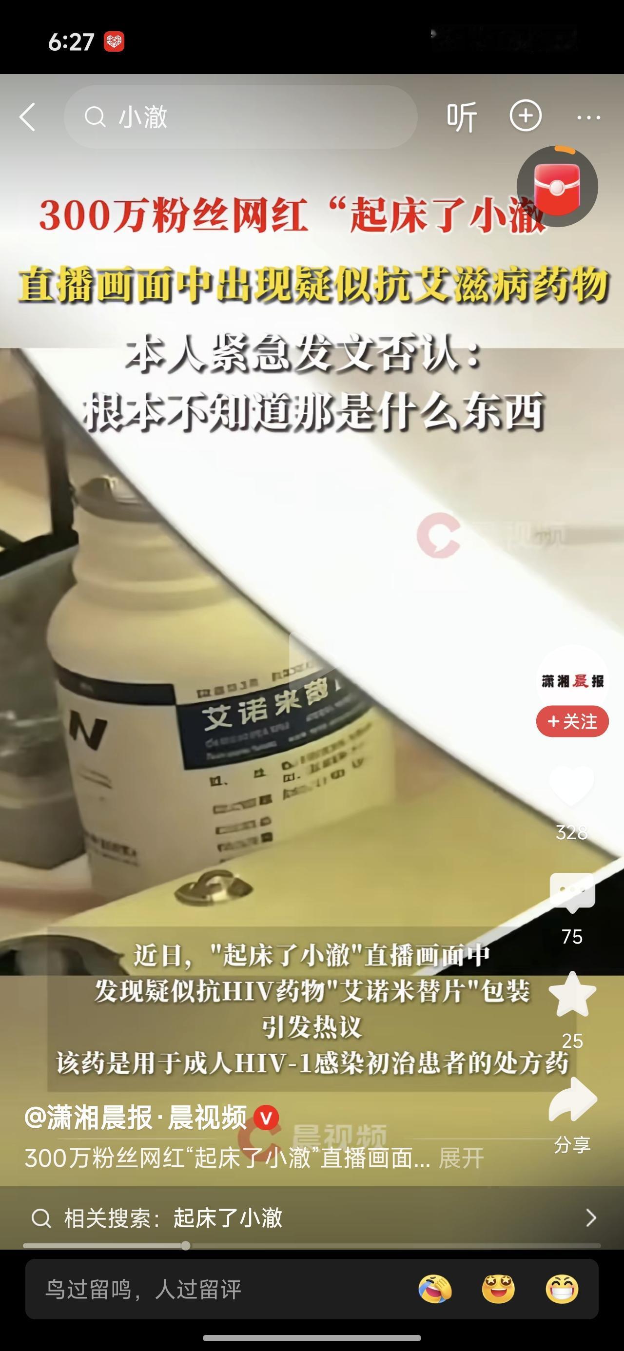 三百万网红拍视频露脸了一个盒子,被眼尖的网友发现是款治疗爱爱 滋滋并并的药物。 本人立马否认。 这个如果不是本人用的,有可能是同伴用的,也太不小心了。你要说与这个药物完全没瓜葛。也不太可信。 你不用它,或者用不到它,它都不可能出现。你说你好奇买着玩,谁信。榜一大哥这下好了,一千万个🦙羊驼路过受伤的小心灵。 我家里高血压,糖尿病,心梗急救的药都有,我不吃,就是买着玩,我有病啊!唉,还真是有,哈哈。 人啊,说到家,私生活不能乱,病人太多了。不小心,唉,中招了。一辈子搭上了。划不来。
