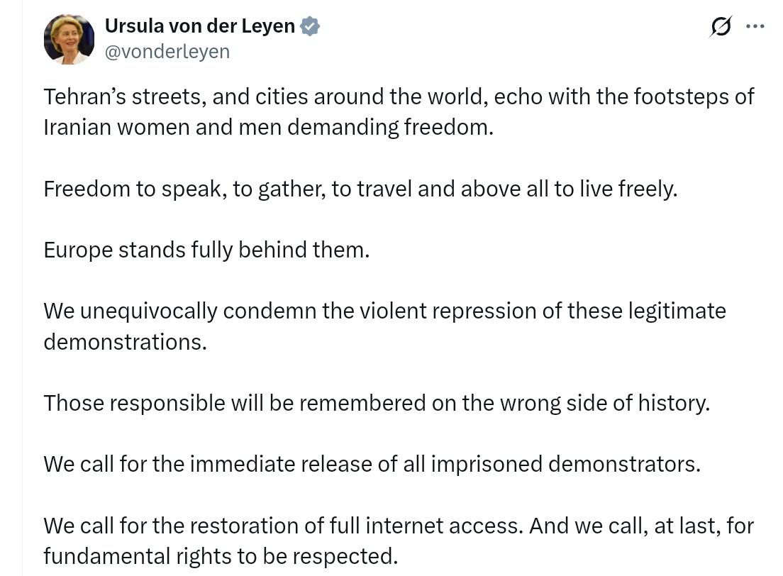 欧盟委员会主席乌苏拉·冯德莱恩: 德黑兰的街道,以及世界各地的城市,都回荡着伊朗男女要求自由的脚步声。 言论自由、集会自由、旅行自由,最重要的是,生活自由。 欧洲全力支持他们。 我们毫不含糊地谴责对这些合法示威活动的暴力镇压。 那些肇事者将被历史铭记,永远被钉在耻辱的一边。 我们呼吁立即释放所有被监禁的示威者。 我们呼吁恢复全面的互联网接入。最后,我们呼吁尊重基本人权。