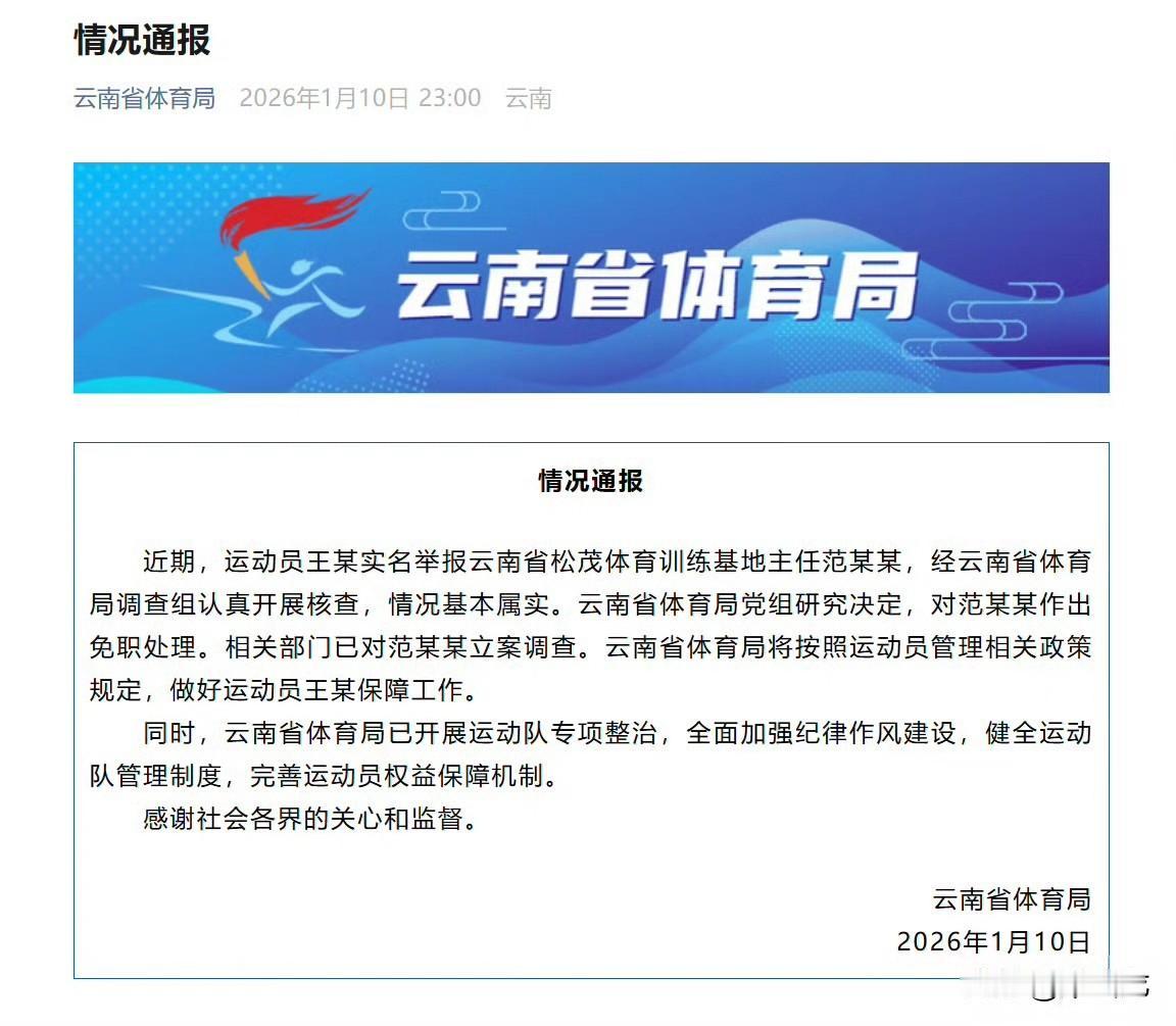 云南省体育局深夜发布通报:运动员王某实名举报松茂训练基地主任范某某情况基本属实,已对范某某作免职处理,相关部门立案调查。 通报是晚上11:00发布的,有点想不通,为什么这么晚才发布。 如果不是熬夜刷视频还没睡觉,差点就错过了。 第2天清晨发布不行吗? 属实就是属实,什么叫情况“基本属实”。 运动员奖金是国家全额发给运动员个人的,这是为国争光者应有的奖励和尊重,范某私自索要,就构成了索贿罪。 王某还举报范某对女运动员有猥亵行为,通报中为什么没有提及。 王某曾通过正规渠道申诉三个月却石沉大海,被迫选择网络举报,监管部门为什么形同虚设。