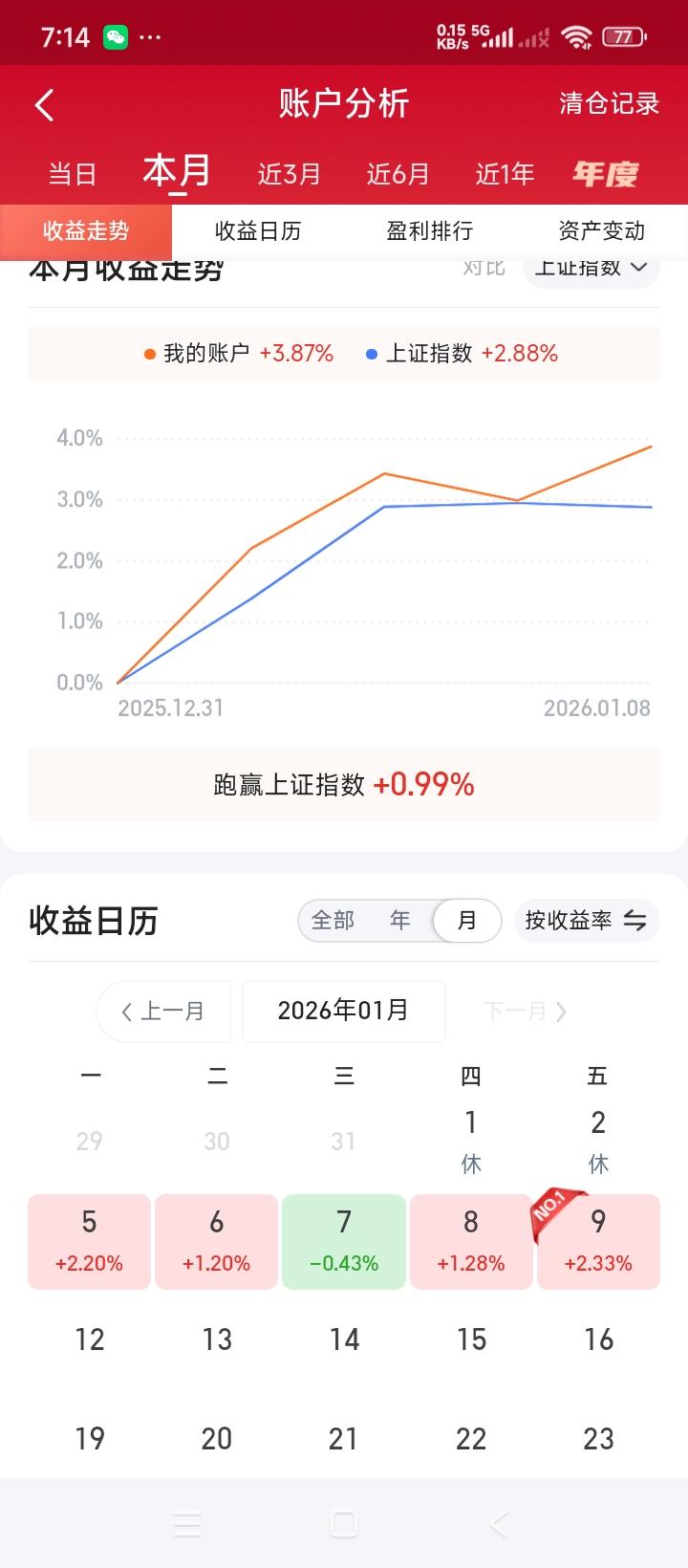 今年股市第一周交易,还算差强人意。 收益不算好,勉强也算是红盘,把去年亏损的百分之九点几基本上抹平了。 明天是2026年的第二周交易,期望本人账户依然能保持周红盘。 靠炒股发财,初入股市时是有这样的想法。 在股市里几次被按在地板上磨摩擦后,就不敢想了。 现在只盼着,一是个人账户能跑赢指数,二是,账户资金能保持赢利,不管是赢多赢少,就算可以了。