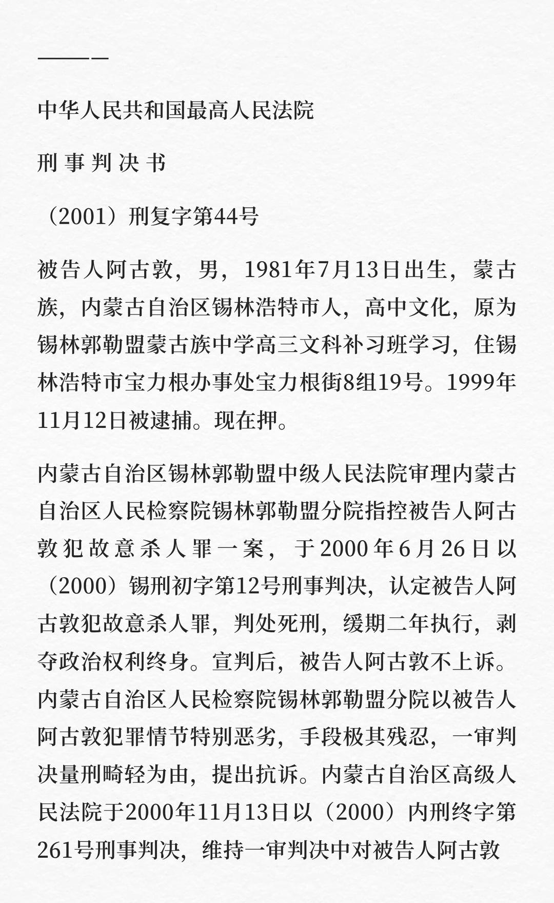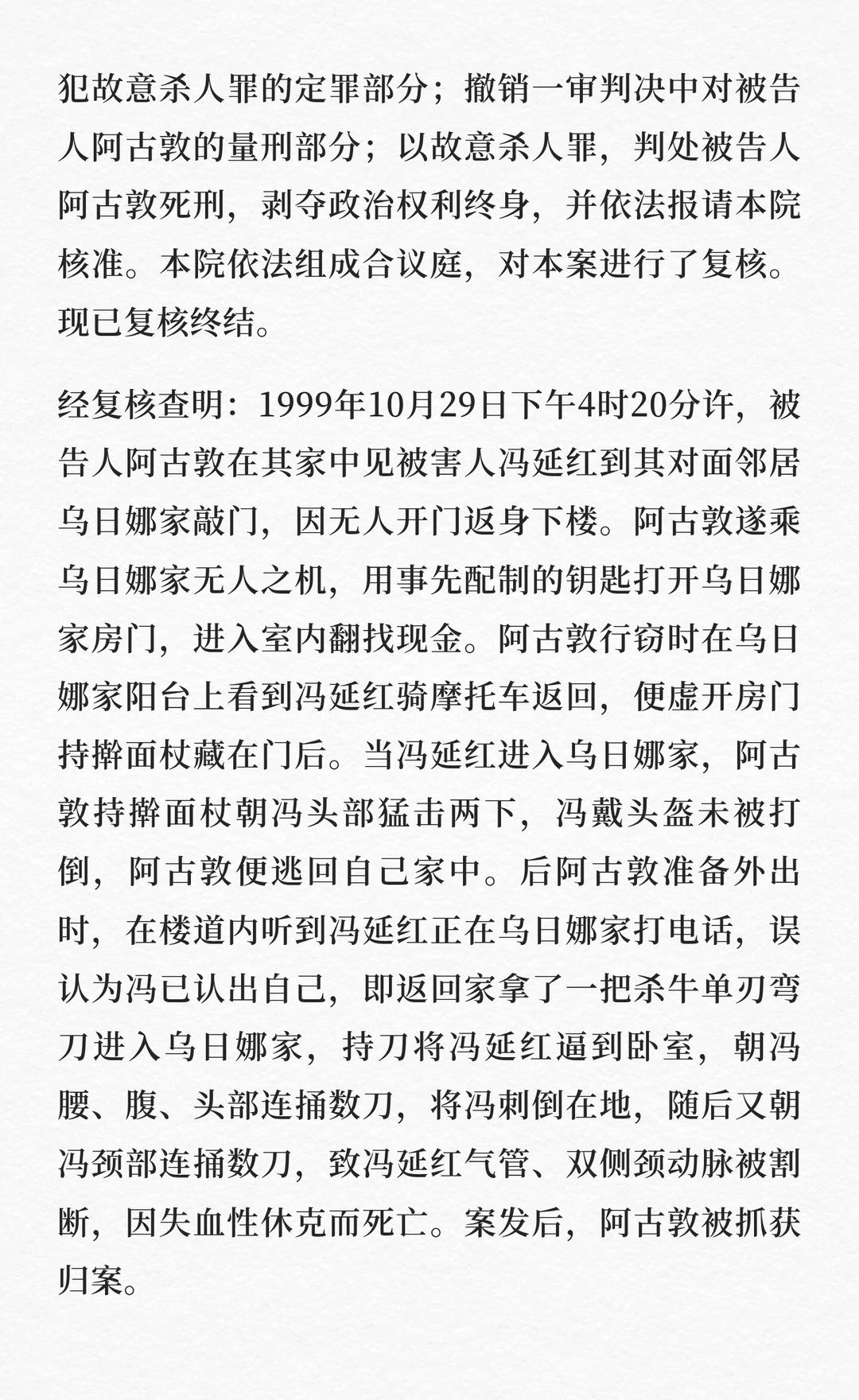 阿古敦故意杀人死刑复核判决书—— 被告人阿古敦因盗窃未遂,将被害人冯延红杀害。经鉴定,其患有分裂型人格障碍,为限定刑事责任能力人。最高人民法院裁定改判其无期徒刑,剥夺政治权利终身,体现了对限制行为能力人从轻处罚的原则。成都紫雅 精神病杀人 梁某滢 梁某滢一审被判死缓