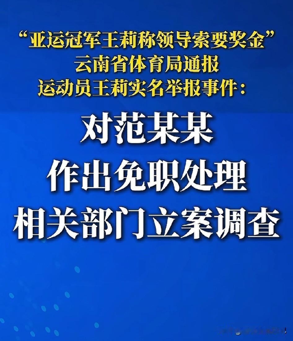 云南体育局凌晨发通报!范某某你把老实人逼急了,孩子15万的奖金你,你竟妄图全部占位己有,实在是太贪婪了。倘若孩子这15万奖金,范某某哪怕只拿走十万,给孩子剩一点,也不至于落到如今这个结局。 通报情况如下:近期运动员王某实名举报云南省商贸体育训练基地主任范某某,经查情况基本属实,云南省体育局党组研究决定对范某某作出免职处理,相关部门已对范某某立案调查,云南省体育局将按照运动员管理相关政策规定,做好运动员王某保障工作。