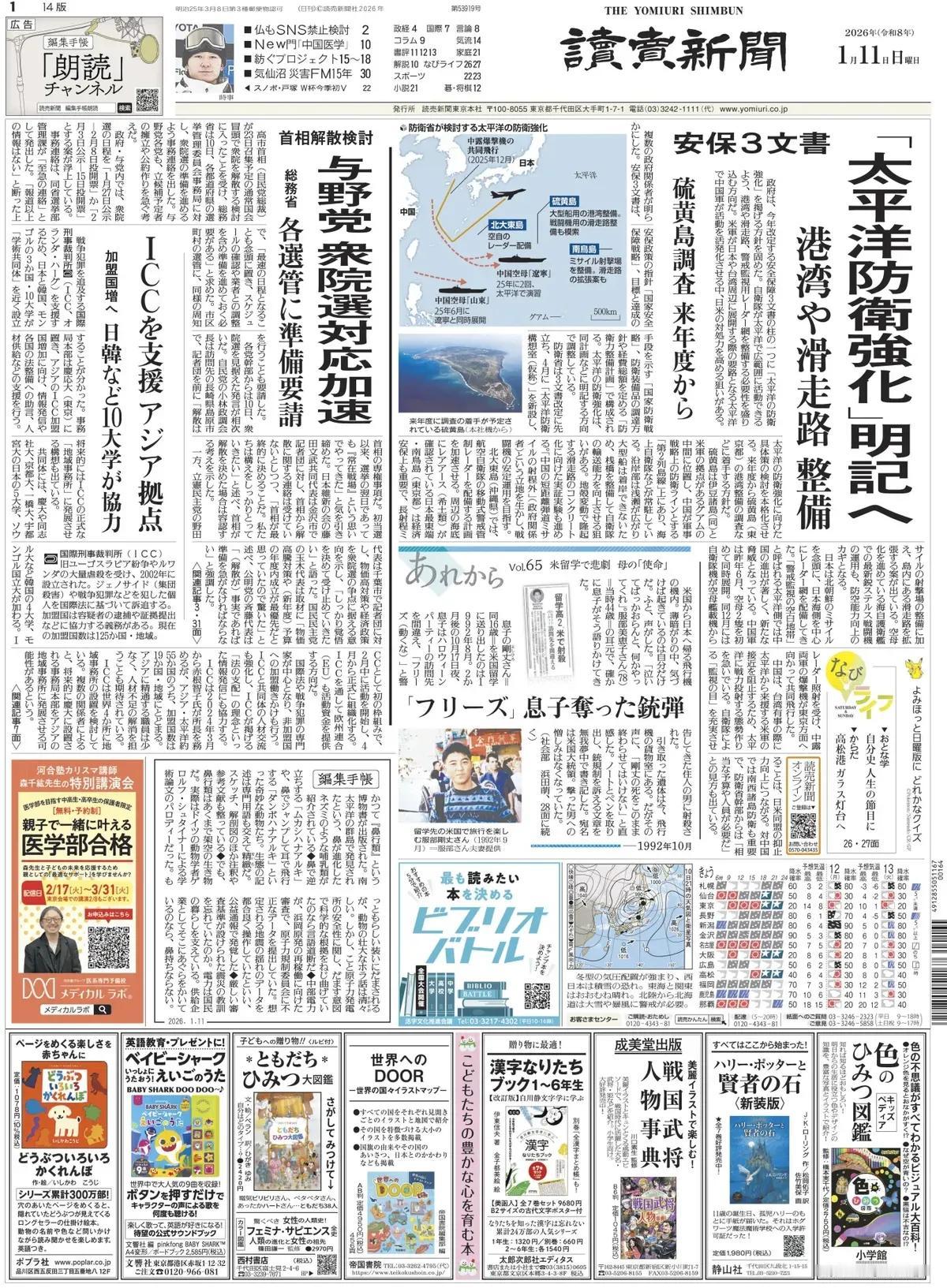 日本提出加强太平洋的防卫计划,平衡区域大国影响力。 日本《读卖新闻》头版报道称,日本政府已经确定方针,在今年将修订的三份安全保障文件的支柱之一是“加强太平洋的防卫”。计划纳入的内容包括,为了让自卫队能够在太平洋广泛活动,有必要建设港口、跑道以及用于警戒监视的雷达网络。在美国军队在日本和台湾周边部署的重要通道——太平洋,中国军队活动日益活跃的情况下,此举旨在提高日美的应对能力。 多位政府官员透露。 这三份安全文件包括《国家安全战略》(指导安全政策)、《国防战略》(指明实现目标和手段)以及《国防能力发展计划》(规定国防装备采购政策和总支出)。 加强太平洋防御正按照计划中指定的方向进行协调。 在三份文件修订之前,国防部于四月成立了“太平洋防御概念办公室(暂定名称)”,开始全面考虑加强太平洋防御的具体措施。 从下个财政年度起,计划启动硫磺岛(东京)港口开发调查。 硫磺岛位于伊豆群岛和关岛之间的中点,关岛是美军基地所在地,位于中国用作军事战略防线的“第二岛链”上,海上自卫队及其他部队驻扎于此。 由于沿海水浅且大型船舶无法靠岸,旨在通过改善码头提升自卫队的运输能力。 还将对因构造运动抬升的混凝土跑道进行示范实验。 利用其“超出中国短程弹道导弹射程”(政府官员)的地位,旨在确保战斗机的稳定作战。 在北大东岛(冲绳县),部署空中自卫队机动预警控制雷达的计划将加快。 东京南鸟岛是日本最东端,周围海床已确认稀土,对经济安全也很重要,除了建设远程导弹射击场外,岛上还有扩建跑道的计划。 在海上自卫护卫舰上装备最先进的隐形战斗机,这些护卫舰正逐步转型为航空母舰,也是提升防空能力的关键。 日本主要在日本海一侧部署雷达网络,主要针对朝鲜导弹。 在被称为“警戒与监视空白区”的太平洋一侧,中国的推进意义重大,已成为新的威胁。 去年六月,中国军方首次同时部署了两艘航母。 同年12月,自卫队飞机被航母雷达照射,中俄军队的轰炸机联合飞向东京。 中国正急于准备向太平洋部署兵力,以防止台海紧急情况下美军从太平洋进入。 加强自卫队的“监视眼”将增强日美同盟的威慑力。 防御南西群岛对抗中国也很重要,日本防卫省高级官员认为“需要相当可观的预算和人员”。