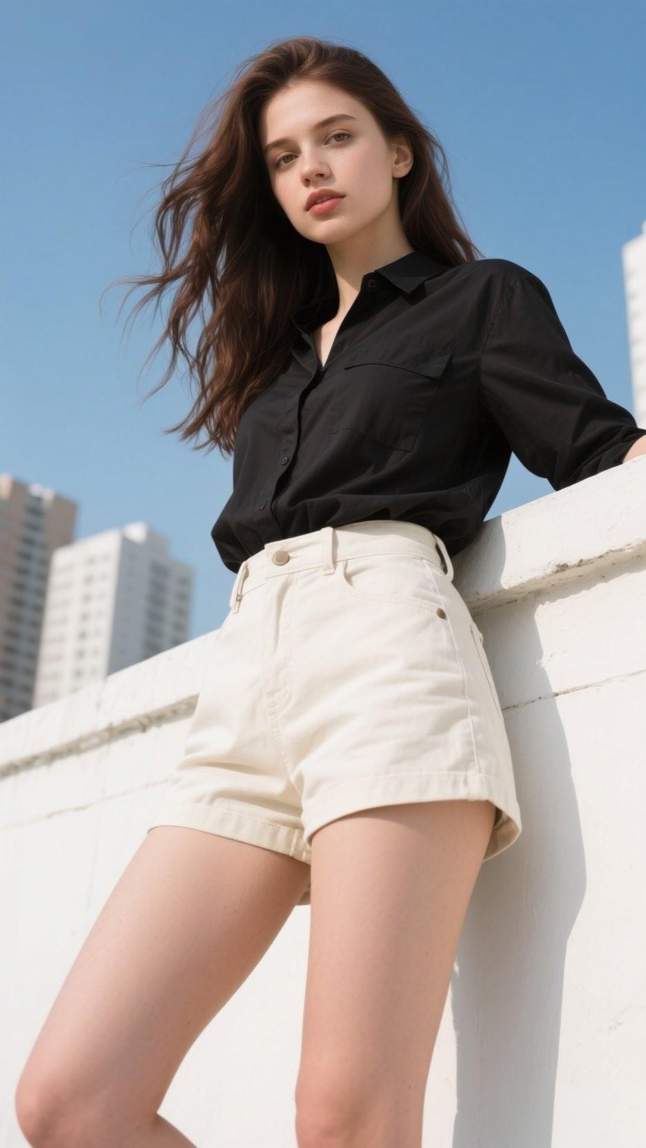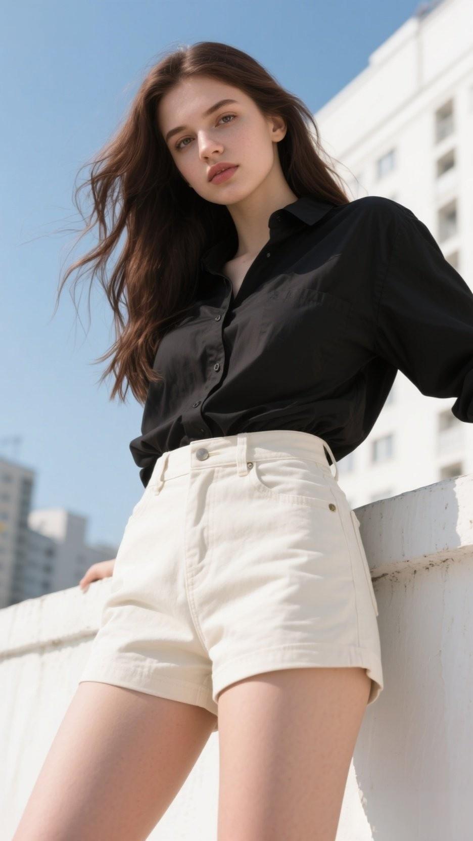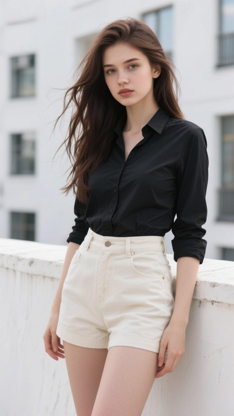 黑色衬衫搭配米色短裤,这组合就像是都市风穿搭里挖到的“宝藏盲盒”,一打开满是惊喜! 黑色衬衫可是时尚界的“六边形战士”,作为经典基础款,适配度简直爆表。它简约的剪裁,流畅的线条,仿佛自带一层优雅的滤镜。长袖设计在秋冬就像给你裹上了一层温暖又神秘的“隐形毛毯”,藏着恰到好处的神秘感。而且不管是紧身款还是宽松款,都能像个贴心的造型师一样,把你的身形凸显出来。 米色短裤则如同春日里的一抹暖阳,柔和明亮。和黑色衬衫搭配在一起,就像两个默契的搭档,低调又高级,简单却绝不单调。这套穿搭简直是个“全能选手”,日常出行穿上它,让你清新得像一朵山间小花;休闲聚会、朋友聚餐时,又能像一颗独特的星星,展现魅力,彰显精致品位。别犹豫啦,赶紧试试这简约时尚的搭配,说不定你就是下一个时尚宠儿! 高腰白短裤搭配