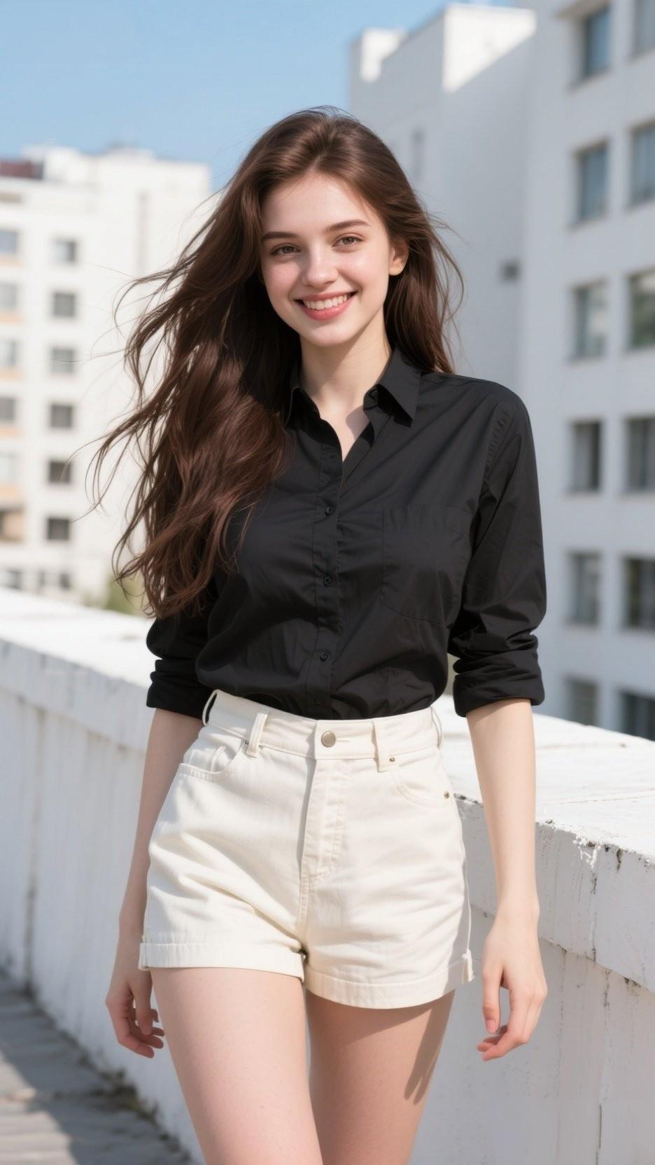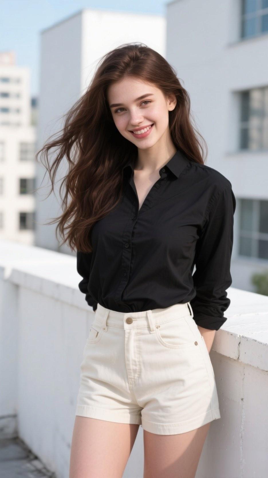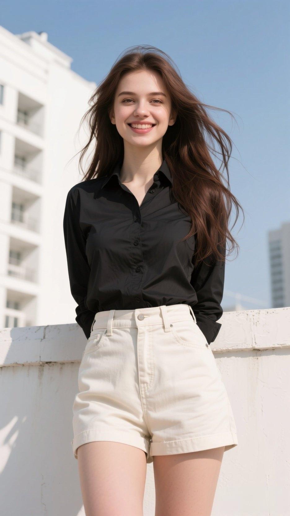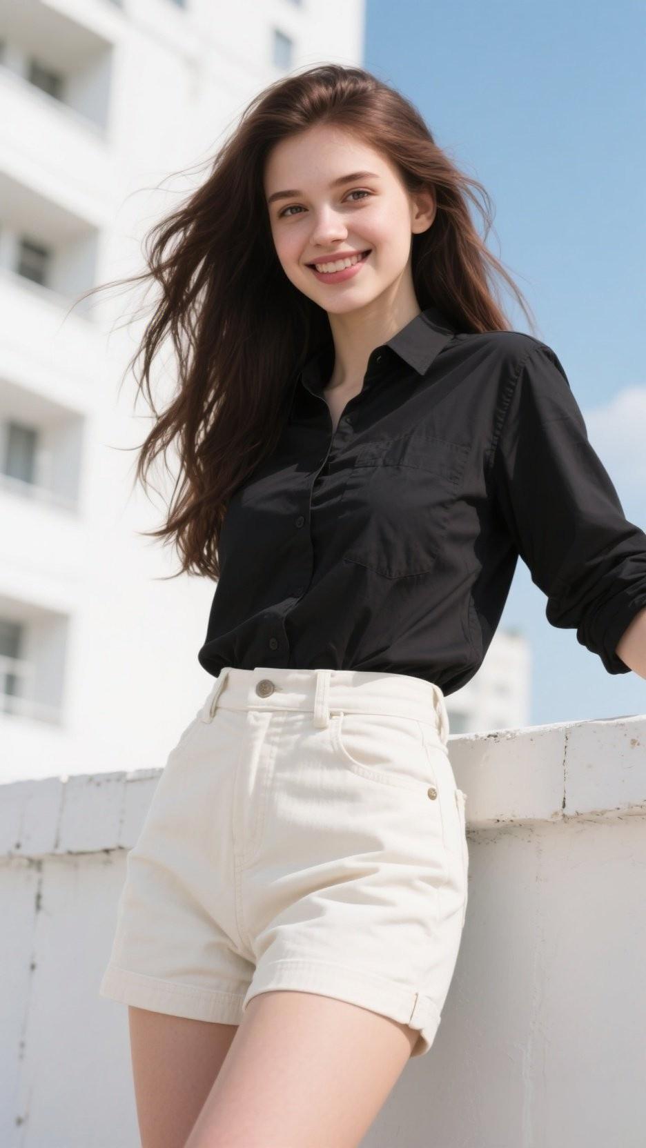 黑色衬衫搭配米色短裤,这组合就像是都市风穿搭里挖到的“宝藏盲盒”,一打开满是惊喜! 黑色衬衫可是时尚界的“六边形战士”,作为经典基础款,适配度简直爆表。它简约的剪裁,流畅的线条,仿佛自带一层优雅的滤镜。长袖设计在秋冬就像给你裹上了一层温暖又神秘的“隐形毛毯”,藏着恰到好处的神秘感。而且不管是紧身款还是宽松款,都能像个贴心的造型师一样,把你的身形凸显出来。 米色短裤则如同春日里的一抹暖阳,柔和明亮。和黑色衬衫搭配在一起,就像两个默契的搭档,低调又高级,简单却绝不单调。这套穿搭简直是个“全能选手”,日常出行穿上它,让你清新得像一朵山间小花;休闲聚会、朋友聚餐时,又能像一颗独特的星星,展现魅力,彰显精致品位。别犹豫啦,赶紧试试这简约时尚的搭配,说不定你就是下一个时尚宠儿! 高腰白短裤搭配