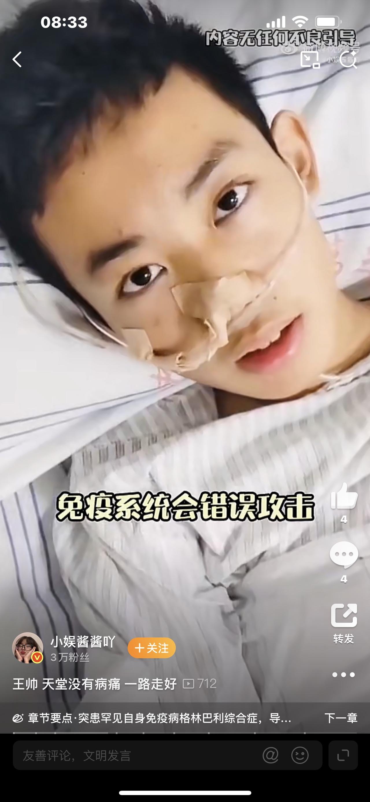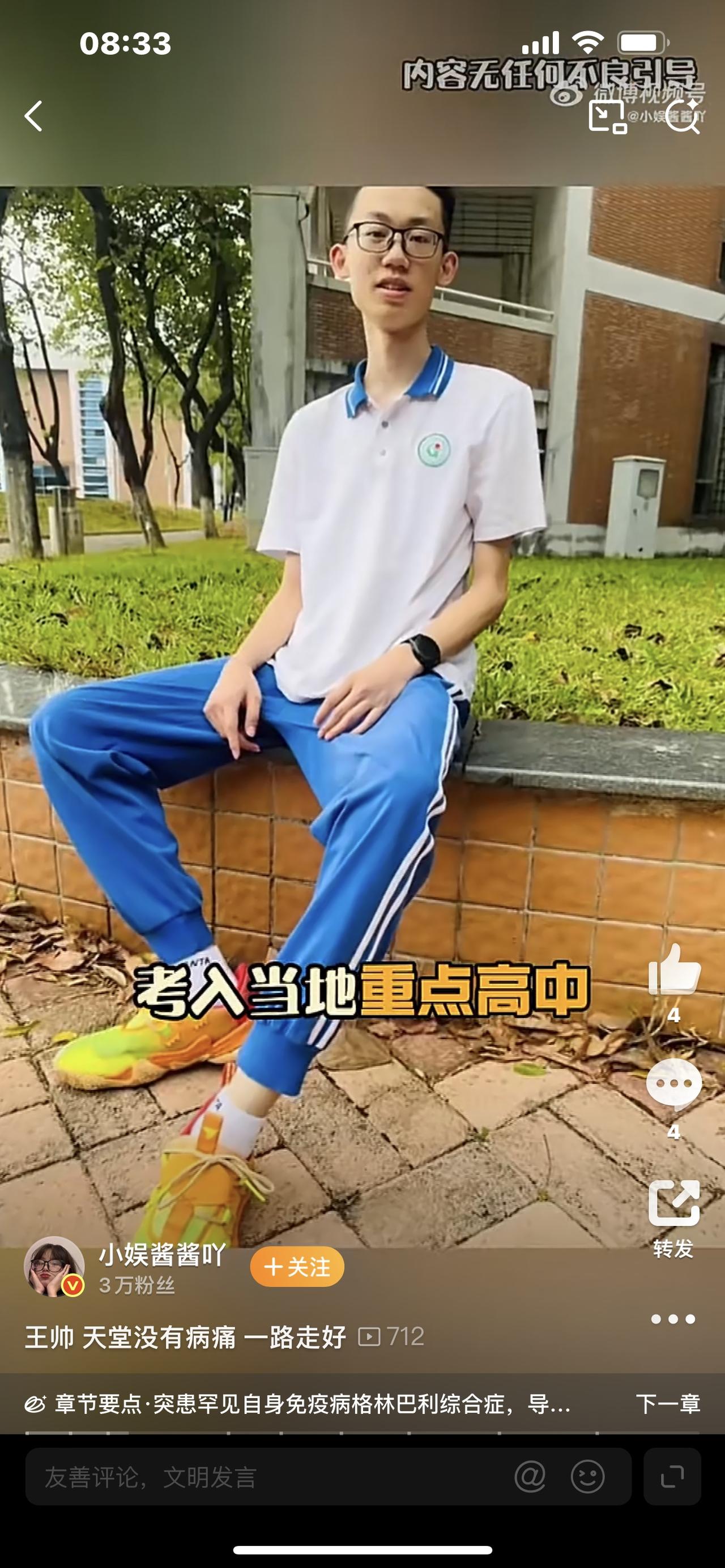 电梯里最后12分钟:20岁学霸跳楼未果投河,拍净灰尘的动作看哭全网 凌晨4点53分,东莞某小区电梯监控拍下揪心一幕:20岁的王帅穿戴整齐,踉跄着按下顶层按钮,眼神里没有丝毫波澜。谁也没想到,这个曾是重点中学学霸的少年,正走向一场与世界的告别。 他本该拥有光明前程——初中时奖状贴满出租屋墙壁,凭硬实力考入当地顶尖高中,是打工家庭走出的"天之骄子"。可命运的重拳来得猝不及防,高中入学仅一个月,他确诊罕见的格林巴利综合征,从酷爱篮球的阳光少年,变成连站立都困难的病人。四年间,父母带着他辗转北京、广州求医,父亲辞掉干了16年的工作全程陪护,为了给他留一线生机,父母甚至再生了一个妹妹,储存脐带血盼着干细胞移植能创造奇迹。 这个骨子里倔强的男孩从没放弃过,在康复室里没日没夜训练,2023年坐着轮椅重返校园,咬牙坚持了一年多。就在大家以为希望在前时,转折点却猝不及防——2024年12月,剧烈腹痛和呕吐再次将他拽回病床,日夜折磨让他无法进食入睡,哪怕短暂好转也只是暴风雨前的宁静。 监控里的细节更让人破防:跳楼因体力不支失败后,王帅回到电梯,后背和胳膊沾满楼顶白灰。这个向来爱干净的少年没有急着离开,而是扶着墙壁,一下又一下拍打着衣服上的灰尘,直到恢复整洁才走向湖边。他不是不想活,只是被病痛和家庭重担压垮了——看着日益苍老的父母,想着年幼的妹妹,他觉得离开或许是唯一能"放过"家人的方式。 当救援人员找到他时,这个20岁的少年已无生命体征。网友们在评论区泪崩:"他拍的不是灰尘,是不想给家人留一点麻烦""如果不是疼到极致,谁会放弃妹妹的脐带血希望"。数据显示,青少年抑郁症患病率已达15%-20%,像王帅这样被疾病和压力裹挟的孩子,还有很多在黑暗中独自挣扎。 我们总歌颂"坚强",却忘了没有人能一直扛住所有苦难。那些看似突然的告别,背后藏着无数个无人知晓的崩溃夜晚。如果家庭能多些情绪倾听,学校能多些心理支持,社会能少些"必须成功"的裹挟,是不是很多悲剧都能避免? 愿天堂没有病痛,更愿每个身处困境的少年都能被看见——你不需要完美,不必硬扛,这个世界总有人愿意为你伸手。如果此刻的你正承受压力,别独自硬撑,试着说说你的难,总会有温暖接住你。 20岁少年投河事件 青少年心理健康 格林巴利综合征