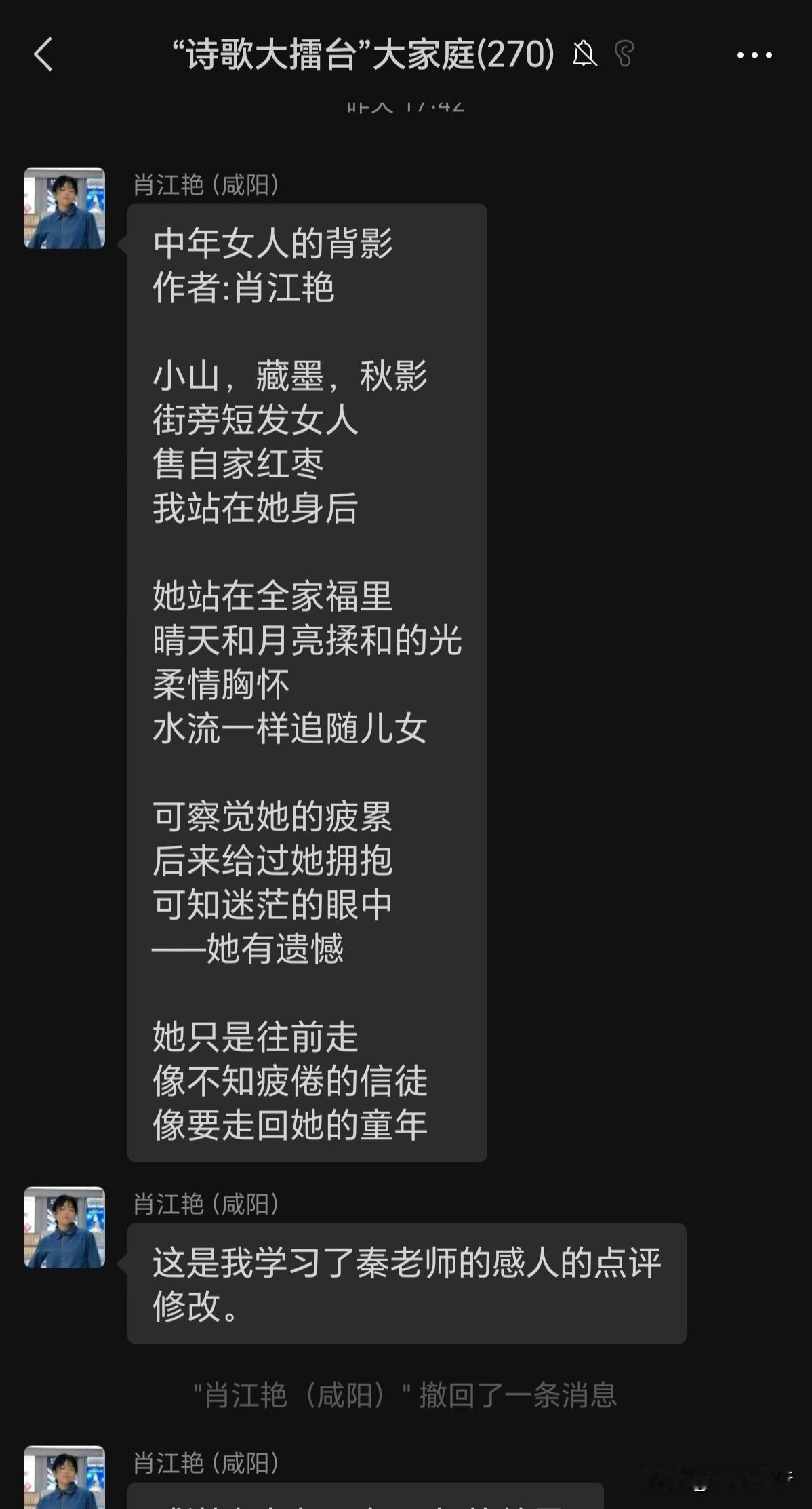 【中国诗歌网“诗歌大擂台”筛选诗】 中年女人 原作者:肖江艳 修改者:狐山诗行 小山、浅墨、秋影 街旁一短发女人 售卖自家的红枣 我站在她身后 世上最轻柔的 莫过于她月下的脚步声 像水流一样追随着黑夜 谁觉察她的劳累 谁给过她温暖 可知迷茫的眼里 ——留有遗憾 她只是往前走 想用不知疲倦的信念 走近自己的生活 2026.1.11.长沙 文学创作大会 附原作: 中年女人的背影 作者:肖江艳 小山,藏墨,秋影 街旁短发女人 售自家红枣 我站在她身后 她站在全家福里 晴天和月亮揉和的光 柔情胸怀 水流一样追随儿女 可察觉她的疲累 后来给过她拥抱 可知迷茫的眼中 ——她有遗憾 她只是往前走 像不知疲倦的信徒 像要走回她的童年 冬日生活打卡季 长沙诗词对联交流圈