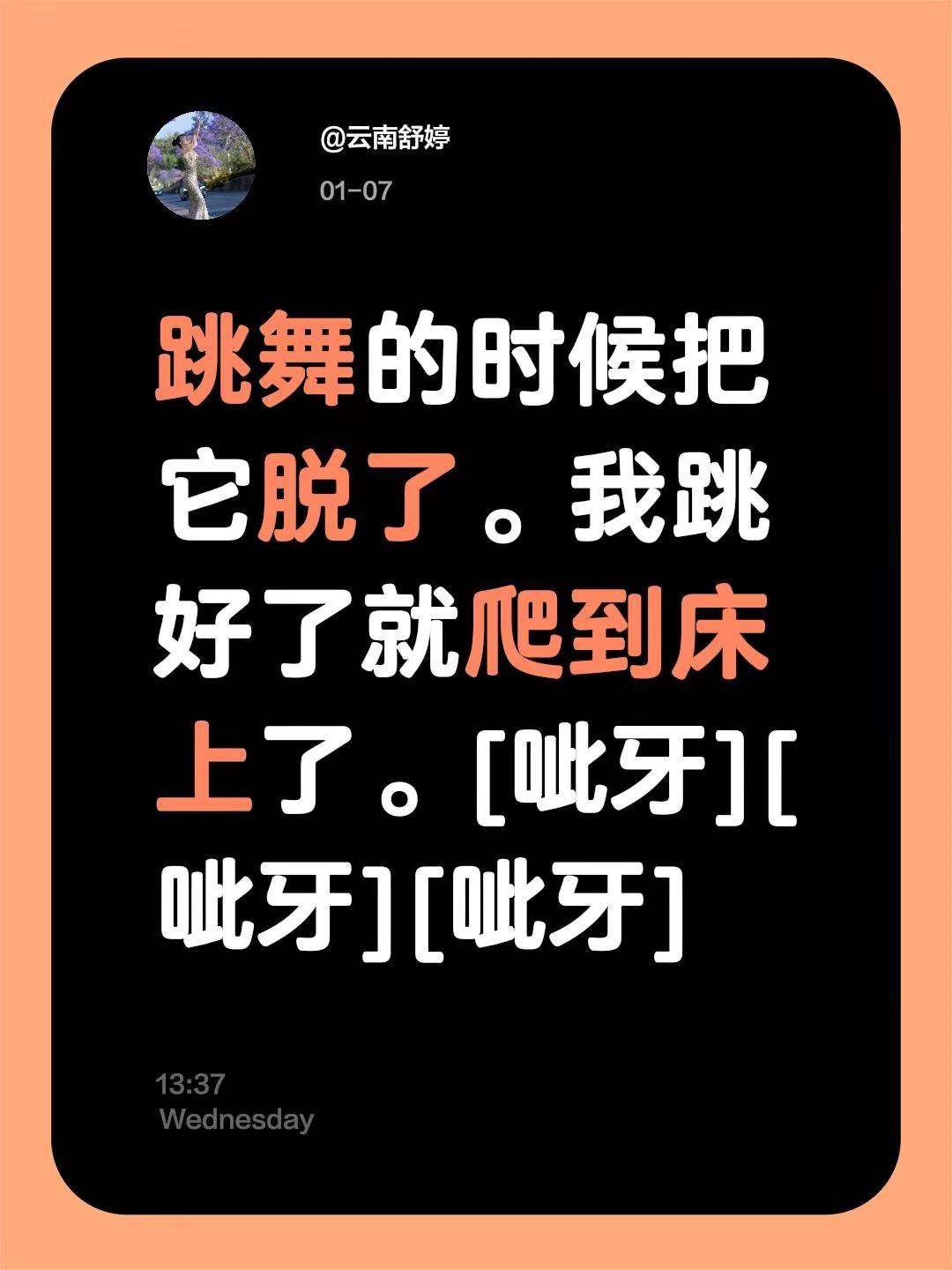 我评论了@云南舒婷 的作品:跳舞的时候把它脱了。我跳好了就爬到床上了。[呲牙][