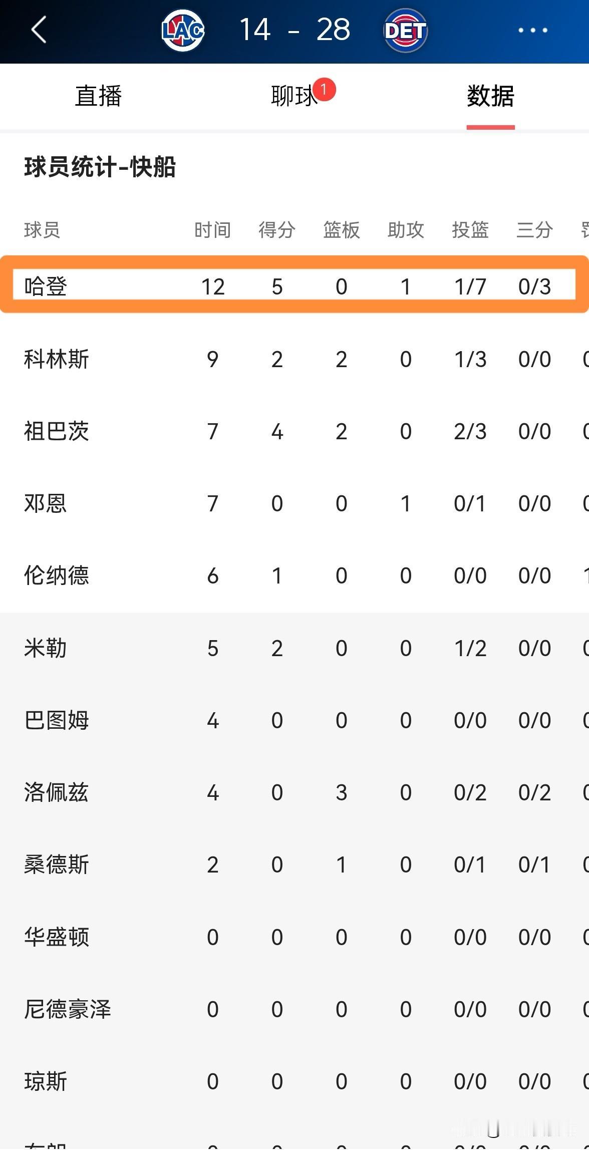 快船超级球星哈登真是太让人意外了!在今天进行的快船和活塞的比赛中,目前双方的第一节比赛已经结束,快船以14:28落后活塞多达14分。最让人感到意外的是,昨天手感滚烫的哈登本场比赛却手感冰凉,哈登在首发出战的12分钟里,投篮7中1,其中三分球3中0、罚球3中3非常低效的得到5分,还有2次失误,他的场上正负值为-14。 请问大家对今天哈登的表现感到意外吗?
