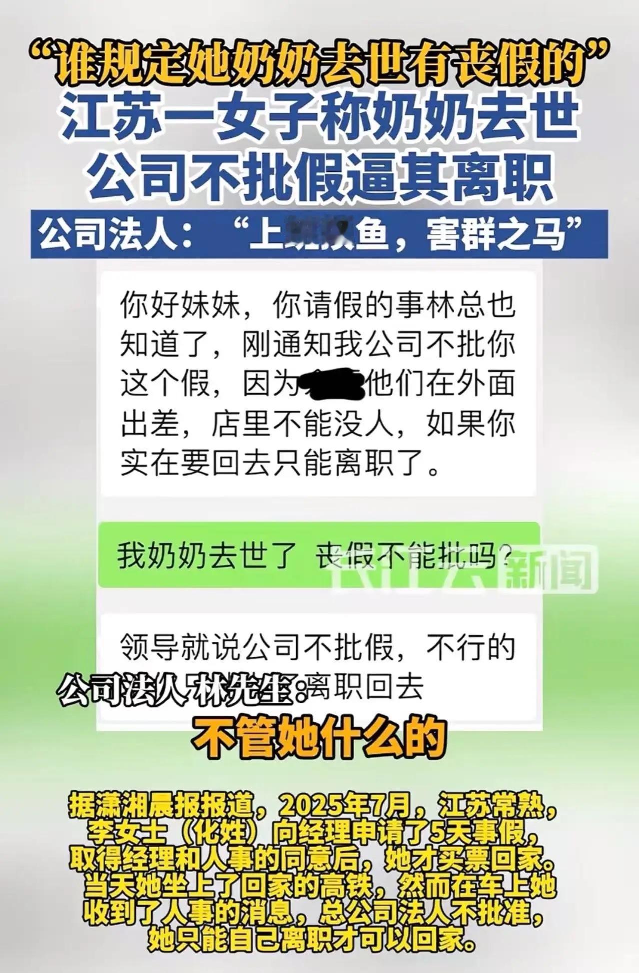 “谁规定她奶奶去世有丧假的!“江苏,一女子奶奶去世,公司老板却不批假逼她离职!老板:“谁家爷爷奶奶不去世,这有什么好请假的……” 事情发生在2025年7月,在当地一家公司做了一年多文员的李女士(化姓),突然接到老家传来的噩耗,从小疼爱她的奶奶不幸离世。 悲痛之下,她第一时间向公司经理和人事申请5天事假,想着赶回老家送奶奶最后一程,在得到两级负责人初步同意后,她立刻买了返乡的高铁票。 可就在列车即将开动时,人事的消息突然发来,总公司法人明确不批准这个假期,要么自己主动离职,要么等回到公司就被开除。 李女士当场情绪崩溃,她哭着给人事发语音,恳求对方通融,哪怕等奶奶丧事办完再回来协商,也不想在这种特殊时刻被逼着做决定,但对方始终没有松口。 她想不通,自己入职以来一直踏实工作,只是想尽一份孙辈的孝心,怎么就成了公司眼里不能通融的事。 更让她无奈的是,公司法人后来提及此事时,不仅没有丝毫体谅,反而直言不讳地否定了她请假的合理性,觉得爷爷奶奶离世是人之常情,没必要专门请假。 随着事情发酵,更多细节被陆续披露。李女士提到,公司法人此前曾提出让她从文员转岗销售,她因为职业规划不符没有答应,这或许成为了这次事件的导火索。 法人还指责她上班“摸鱼”,是“害群之马”,但李女士所在的分公司既没有监控,也没有打卡机和WiFi,对方根本拿不出所谓的证据。 更让她气愤的是,入职一年多来,公司始终没有按照规定为她缴纳社保,当初人事提及此事时她没意识到违法,直到这次纠纷发生才重视起来。 无奈之下,李女士在老家处理完奶奶的丧事后,委托律师撰写了《被迫解除劳动关系通知书》邮寄给公司,要求结清工资并支付辞退赔偿金,却迟迟没有得到回应。 直到2025年8月底,她才收到了拖欠的工资,但赔偿金始终没有着落。 在劳动部门的建议下,她选择了申请劳动仲裁,目前已经收到了常熟市劳动人事争议仲裁委员会的受理通知书和开庭通知书,开庭时间定在2026年1月29日。 这起事件之所以引发广泛讨论,核心在于大家对“丧假”范围的关注。 根据现有规定,《劳动法》明确劳动者享有丧假权利,但仅限定直系亲属为父母、配偶和子女,祖父母、外祖父母并未被纳入法定范围,这就给了企业一定的自由裁量空间。 在江苏,当地执行的规定中,职工岳父母或公婆去世可酌情批假,但祖父母离世能否请假,主要看企业自身制度。 现实中,类似的情况并不少见。 有的网友分享自己外公外婆去世时,公司只允许用年假抵扣假期;还有人因为非直系亲属离世请假被拒,只能无奈放弃奔丧。 而从法律实践来看,此前浙江就有案例,员工因亲人病逝未获请假批准仍返乡奔丧,被公司以旷工为由辞退。 最终法院判定公司违法解除劳动合同,支付了相应赔偿金,认为用人单位在行使管理权时应兼顾人文关怀。 目前,李女士正在等待仲裁开庭,她希望通过法律途径拿回自己应得的赔偿金,补缴社保以及被拖欠的加班费。 这场纠纷不仅关乎一个劳动者的合法权益,更让大家重新审视职场中人文关怀的重要性,法律规定的边界之外,企业是否应该多一份对员工情感需求的体谅。 信源:长江云新闻