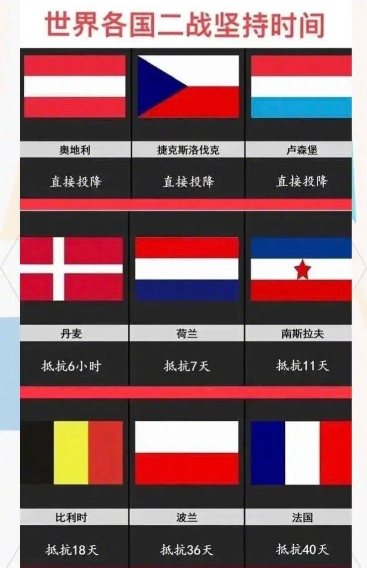 这是世界各国二战坚持时间! 当时,丹麦足足坚持了长达6个小时才投降。 所以,这次特朗普想要吞并格陵兰岛,它能坚持几个小时? 老特这场2026年开年大戏,太让吃瓜群众期待了。