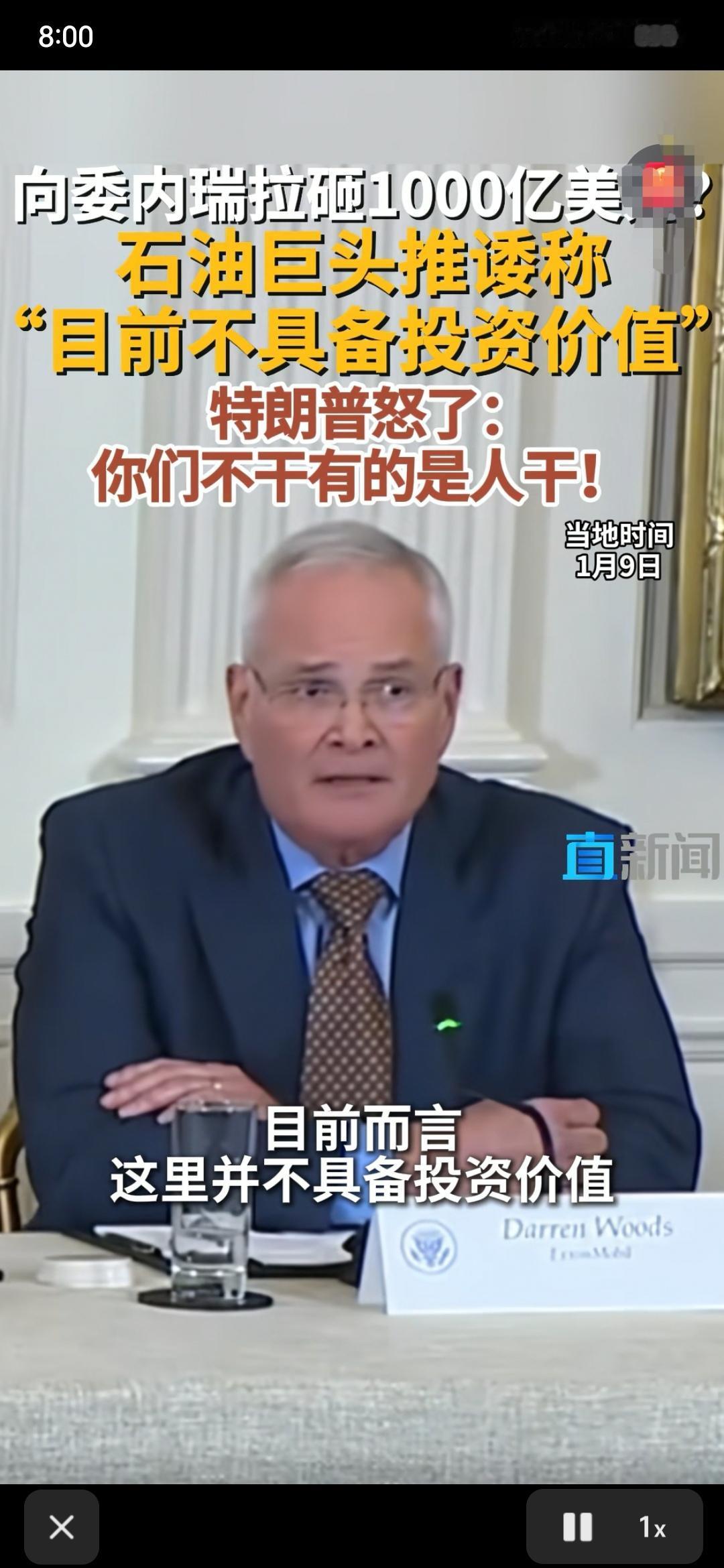特朗普闹了半天从叫花子手里抢了一碗馊饭,拿回去对着一群富商问“你们怎么不吃啊?” 近日,特朗普和美国石油巨头们开了个会,要求他们向委内瑞拉投资1000亿美元,石油巨头推诿称"委内瑞拉目前不具备投资价值",特朗普怒了: 你们不干有的是人干! 这些石油巨头为什么沉默?可能有以下几点: 一 美国的埃克森美孚、雪佛龙等企业在查韦斯政府的"油田国有化"过程中损失惨重,累计损失超过500亿美元,至今没有收回来,他们不想重蹈覆辙。 二 现在委内瑞拉的超重油开采设备老化,损耗很高,原本能日产300万桶的设备,现在只能产85万桶。根据投资调研公司HFI的预测,即便一切顺利,投几百亿美元下去,委内瑞拉原油产量也要到2033年,才可能达到200万桶/日。如要恢复到15年前的产量,则需投入1100亿美元,相当于美国所有油企2024年投资总额的两倍! 三 特朗普付出的成本低,石油公司付出的风险太大。几年后,特朗普拍拍屁股走了,那正好美国石油公司在当地的厂子建起来了,一分钱没挣呢。万一美国新总统不管,委内瑞拉政权直接把那石油厂子一收回,那美国的石油集团纯纯在委内瑞拉做公益了。