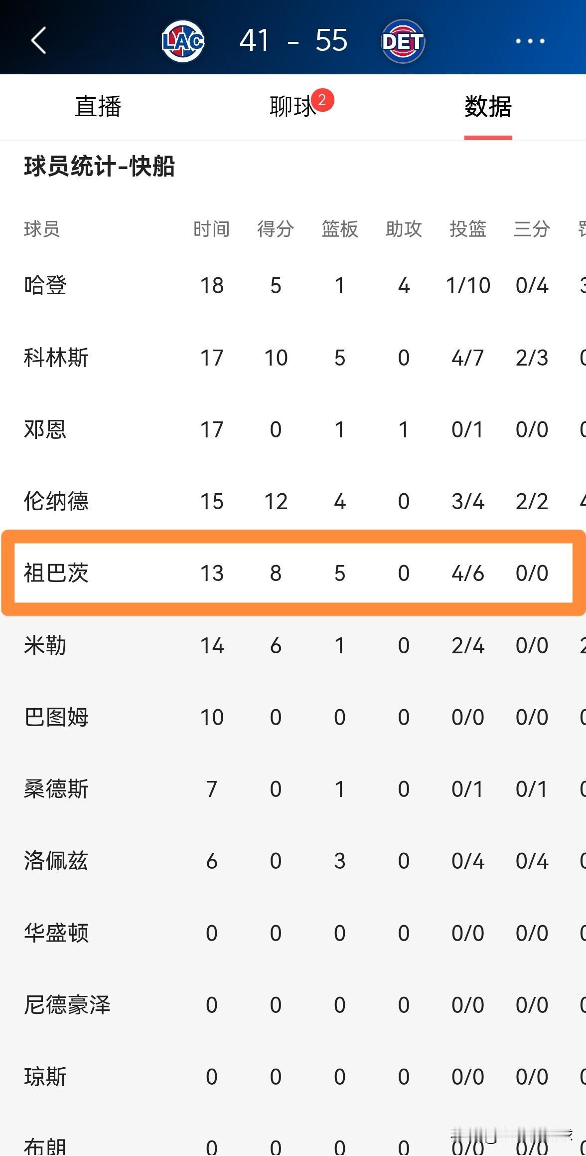 快船当家中锋祖巴茨真是太想赢了!在今天快船客场挑战活塞的上半场比赛中,祖巴茨是球队里最想赢球的球员之一,他在攻防两端都展现出了超强的积极性,可惜的是由于哈登的低迷,快船目前以41:55落后于对手结束了前两节的比赛。 在上半场比赛中,祖巴茨首发出战13分钟,投篮6中4得到8分5篮板2盖帽,他的场上正负值为-8。