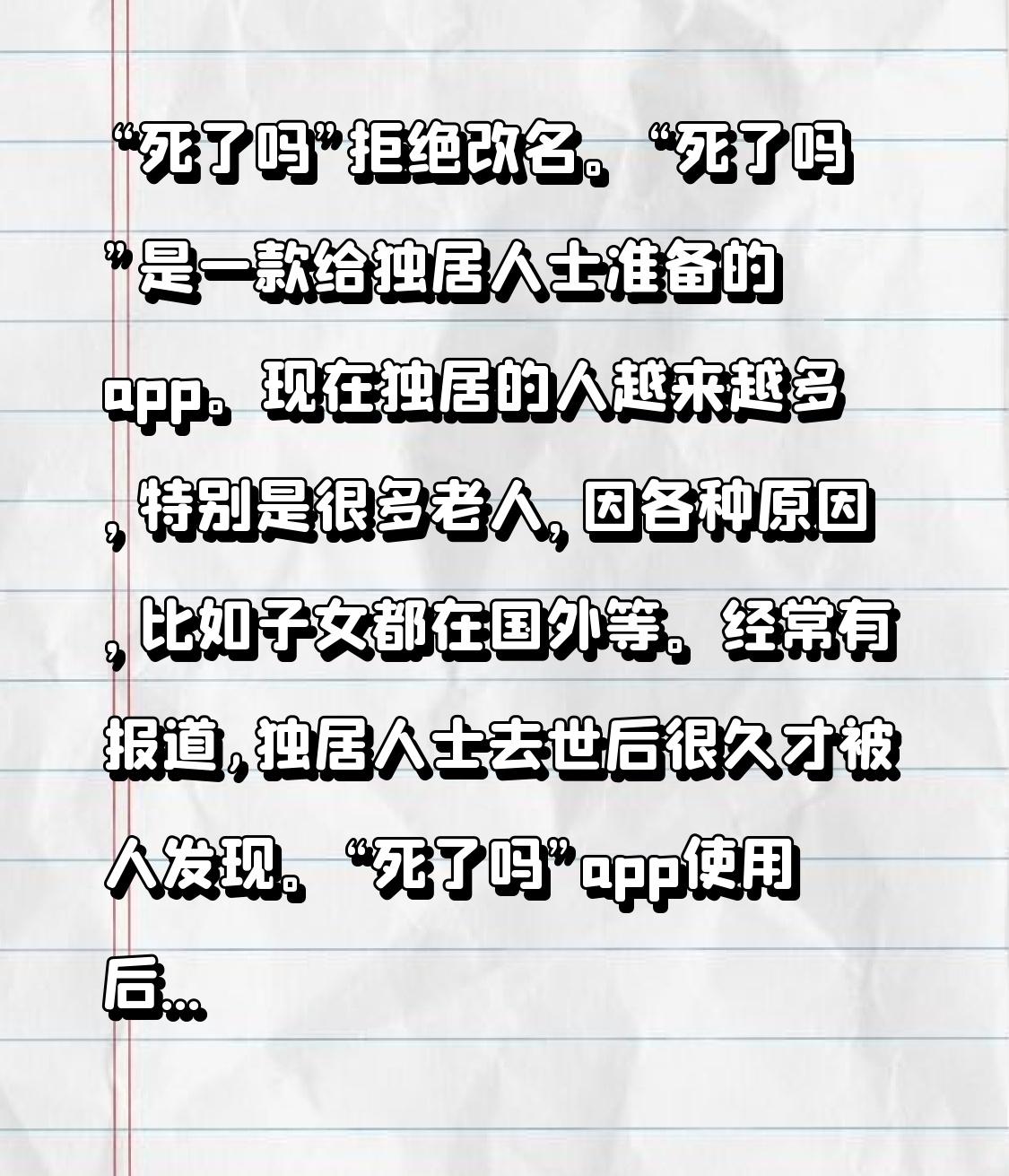 “死了吗”拒绝改名。 “死了吗”是一款给独居人士准备的app。 现在独居的人越来越多,特别是很多老人,因各种原因,比如子女都在国外等。经常有报道,独居人士去世后很久才被人发现。 “死了吗”app使用后,每天需要进去点一下签到,如果多天不签到,就会自动给你的好友发信息,让他们和你联系。 但这款app的名字太可怕了,不过作者现在说不打算改名字。 现在我们逐渐进入老年社会,而社会对老人的关爱还远远不够。我们应该多向其他国家或地区学习,毕竟别人的经验更丰富。