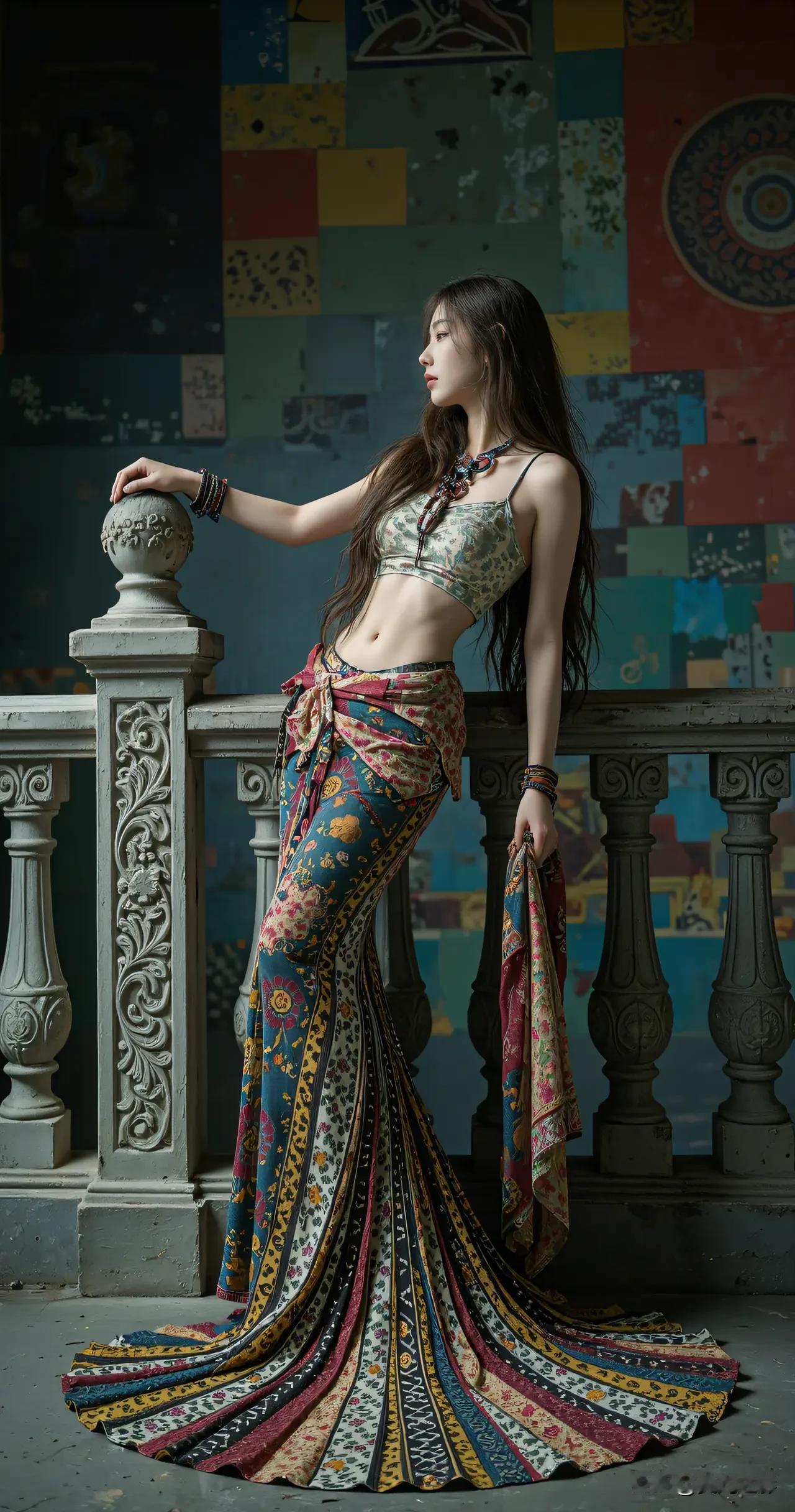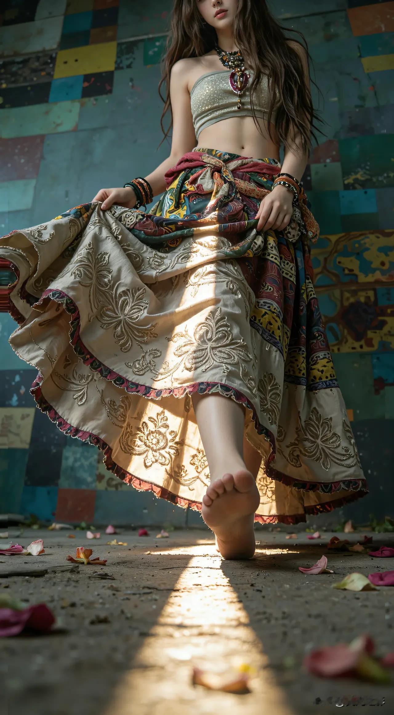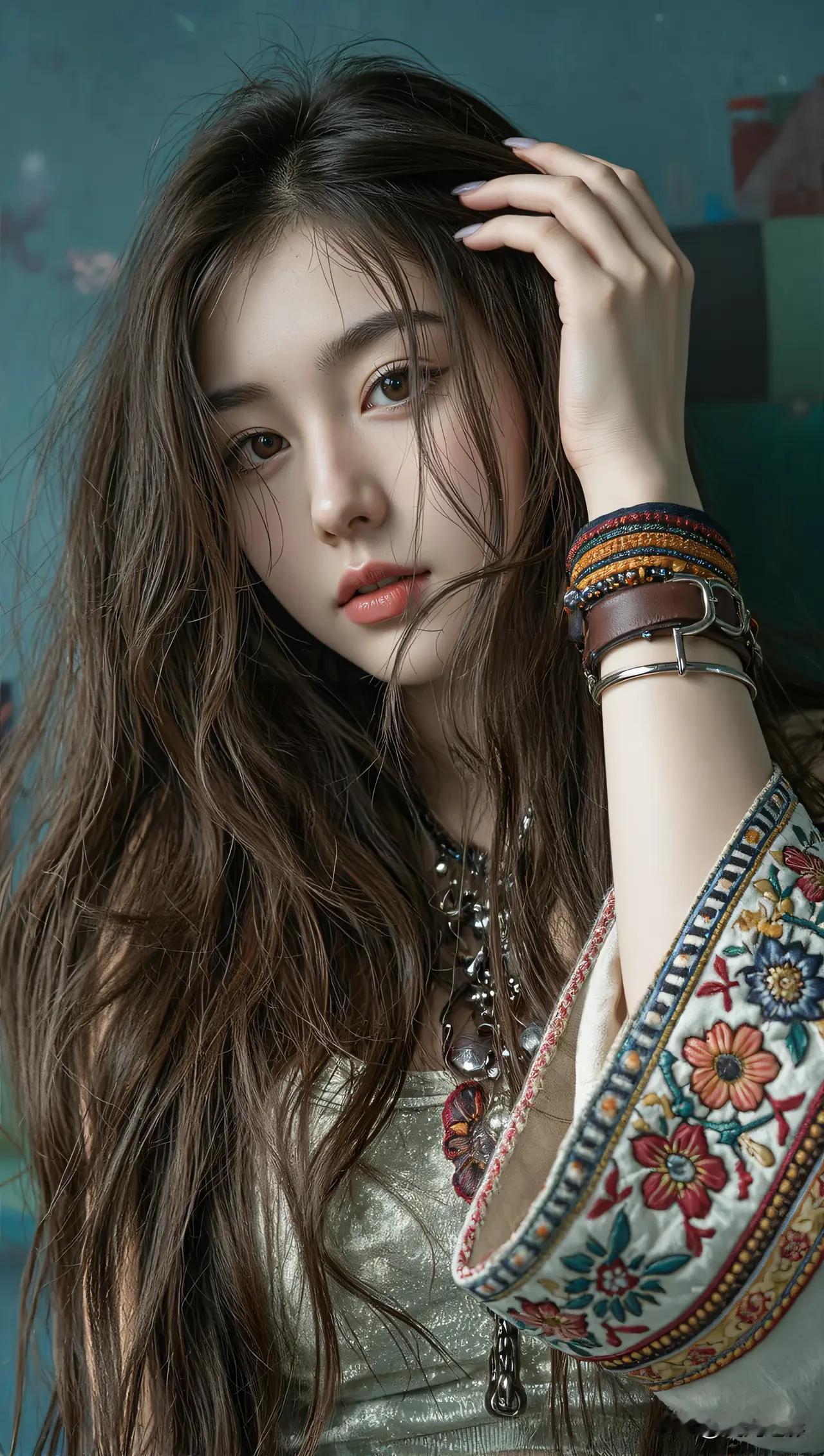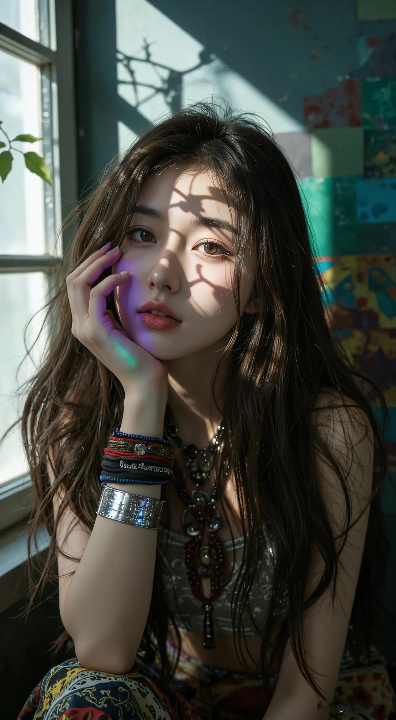 光之影 阳光下的少女,长发飘逸,砖墙背景,时尚项链点缀,美不胜收。 阳光白裙少女