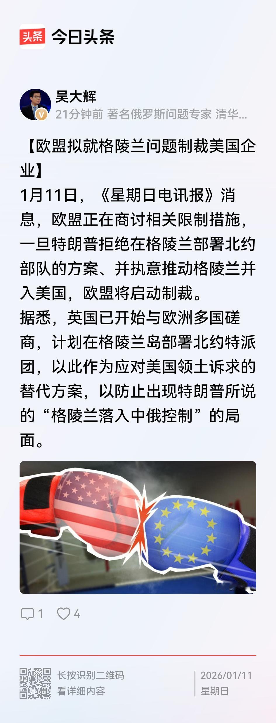 欧盟制裁美国,不知道从哪里下嘴 吴大辉老师引用媒体报道说,欧盟将制裁美国。原因就是抵制美国强取豪夺格陵兰岛(见下图)。 消息说,欧盟正在商讨相关限制措施,一旦特朗普拒绝在格陵兰部署北约部队的方案、并执意推动格陵兰并入美国,欧盟将启动制裁。 我只是说,欧盟作为美国的盟友,如今美国什么都不考虑,专门从盟友内部动手,而且还是产生童话的丹麦动手。欧盟赖以为能够保护自己的大哥,如今翻脸不认人。 欧盟无奈,表态对美国进行制裁。说的挺好,从哪里下手呢?不去没过了,还是不让美国在欧洲驻军了?做得到吗? 正应了咱们那句话:狗咬狗一嘴毛呗!