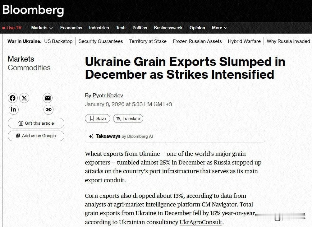 【乌克兰粮食出口大幅下滑:小麦外运量暴跌四分之一】 据彭博社援引分析平台CM Navigator的数据,12月乌克兰小麦出口量暴跌近25%,玉米出口量下降13%。俄方对敖德萨州港口基础设施的打击被列为出口下滑的关键原因,这类袭击严重阻碍了粮食的外运进程。 分析人士指出,2025全年乌克兰粮食出口量较上一产季已出现明显回落。港口及粮食加工企业工人罢工、粮食收割工作延误,再加上全球其他粮食出口大国竞争加剧,进一步加剧了当前的困境。 2025年12月的爆炸袭击造成敖德萨州港口吞吐能力受损,这成为又一负面因素。进入2026年1月后,针对港口基础设施的袭击仍在持续。