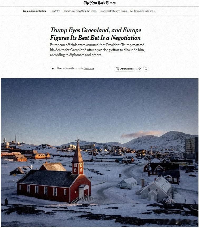 欧洲陷入恐慌:欧盟担忧特朗普就格陵兰岛表态引发武力冲突 《纽约时报》报道,特朗普关于美国或将对格陵兰岛提出领土诉求的表态,给欧洲浇了一盆冷水。丹麦首相梅特·弗雷泽里克森及欧盟各国领导人认为,特朗普的言论令人震惊,已引发广泛恐慌。各方正于私下商讨应对方案,以备美方采取武力施压的情况。 欧洲外交官在私下谈话中坦言,此事的核心并非安全问题或自然资源之争,而在于特朗普的个人野心。他们称,特朗普试图借助格陵兰岛问题“名垂青史”,将这片土地的纳入视为自身地缘政治胜利的象征,进而实现美国领土扩张。 与此同时,欧盟方面寄望于美国国会(包括共和党议员在内)能够约束特朗普,影响其立场。欧洲普遍认为,直接挑战特朗普是一步险棋——外交官们担心,此举或将招致美方激烈且难以预判的反击。 此前,特朗普曾放言,美国准备“不惜一切手段”解决格陵兰岛相关问题。