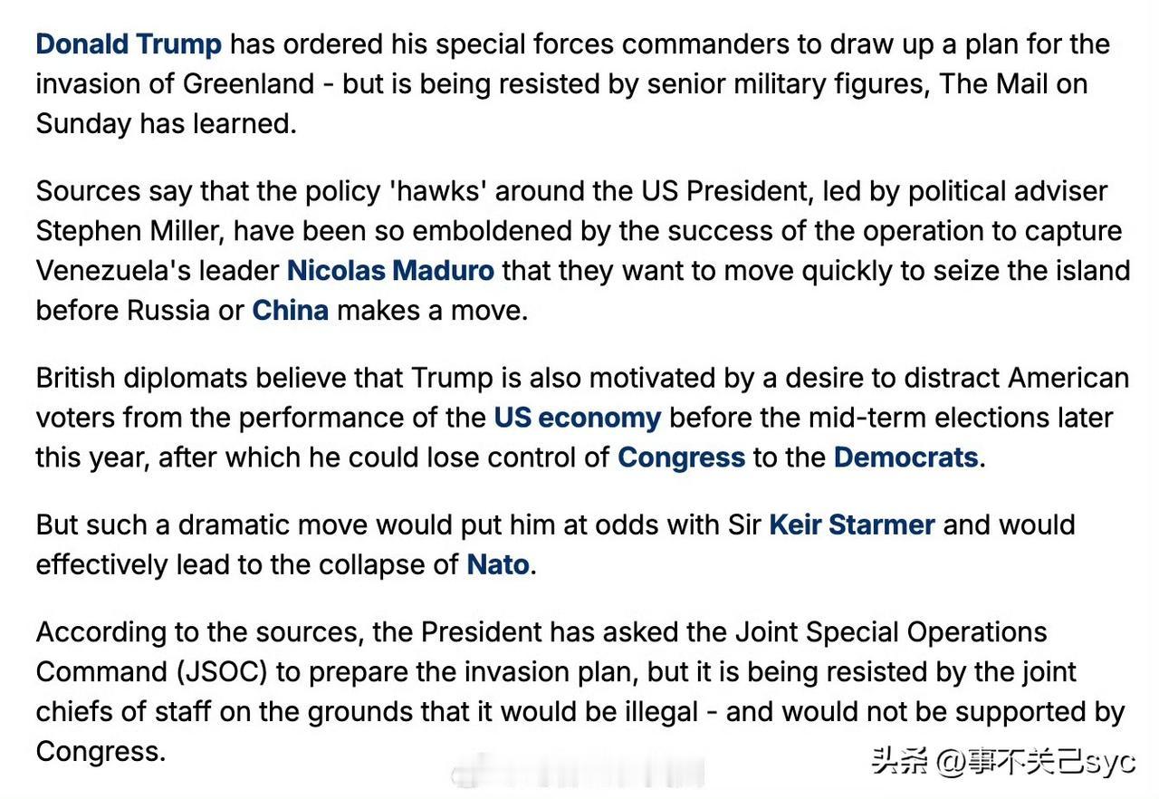 :特朗普已经下令其特种部队指挥官拟定占领格陵兰的计划,军方高层人士对此表示反对。 消息人士称,由斯蒂芬·米勒()Stephen Miller)领导的“鹰派”政策团队,在成功抓捕马杜罗的行动后士气大增,他们希望迅速行动,夺取格陵兰。 《每日邮报》报道称,特朗普已指示特种作战部队指挥官拟定占领格陵兰岛计划,由政治顾问斯蒂芬·米勒领导的鹰派团队推动。该团队因成功抓捕委内瑞拉总统马杜罗而士气高涨,主张速战速决夺取该岛。美媒推演"四步走"策略:煽动独立运动→经济利诱→施压欧洲默许→军事入侵,相关行动或已启动。