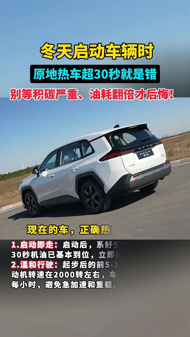 冬天启动车辆时原地热车超30秒就是错,别等积碳严重、油耗翻倍才后悔! 冬天伤车的不是冷,而是"积碳"。长时间原地热车,发动机低温运行,汽油燃烧不充分,会产生大量积碳。这些胶状物会附着在火花塞、喷油嘴和气缸内,导致动力下降、怠速抖动、油耗飙升,严重时需要拆洗整个进气系统,花费高昂。 原地热车,为什么是错上加错? ·1.升温极慢:发动机空转,产生的热量很少,水温上升速度不到正常行驶时的四分之一。 ·2.润滑不佳:虽然机油开始循环,但变速箱、差速器等部件并未同步预热,得不到充分润滑。 ·3.污染加剧:汽油会窜入机油,稀释机油,破坏其润滑保护能力。 现在的车,正确热车只需两步: ·1.启动即走:启动后,系好安全带、耗时约30秒机油已基本到位,立即挂挡低速起步。 ·2.温和行驶:起步后的前5-10分钟,保持发动机转速在2000转左右,车速不超过60公里每小时,避免急加速和重载。