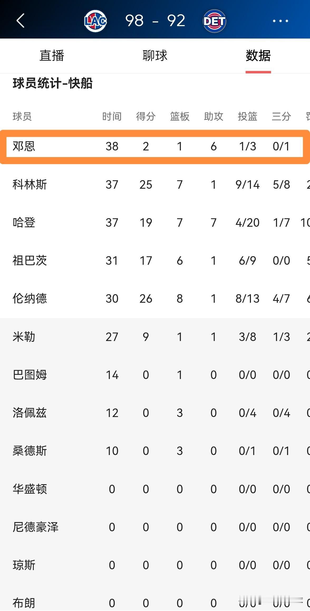 快船大将邓恩真是一位防守大师!在今天快船客场以98:92击败活塞的比赛中,邓恩展现出了大师级别的防守水准,他在首发出战的38分钟里,投篮3中1得到2分,不过有6助攻4抢断,他的场上正负值为+6。 虽然邓恩不擅长投射,但是他的防守能力绝对是联盟的顶级水准,本赛季开赛以来邓恩场均可以贡献1.4次抢断。