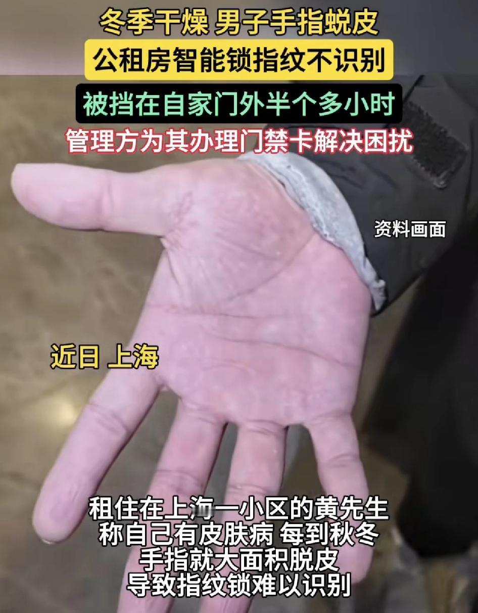 上海一名男子每到秋冬季节,手掌大面积脱皮,导致每次回家指纹锁识别不了,有时候被锁在门外达到半个小时,多次按锁的时候还会被锁定,但是自己租的是公租房,按照规定也不能转租出去。与管理处协商之后,协商管理处为其办理了一张门禁卡,解决了这个难题。