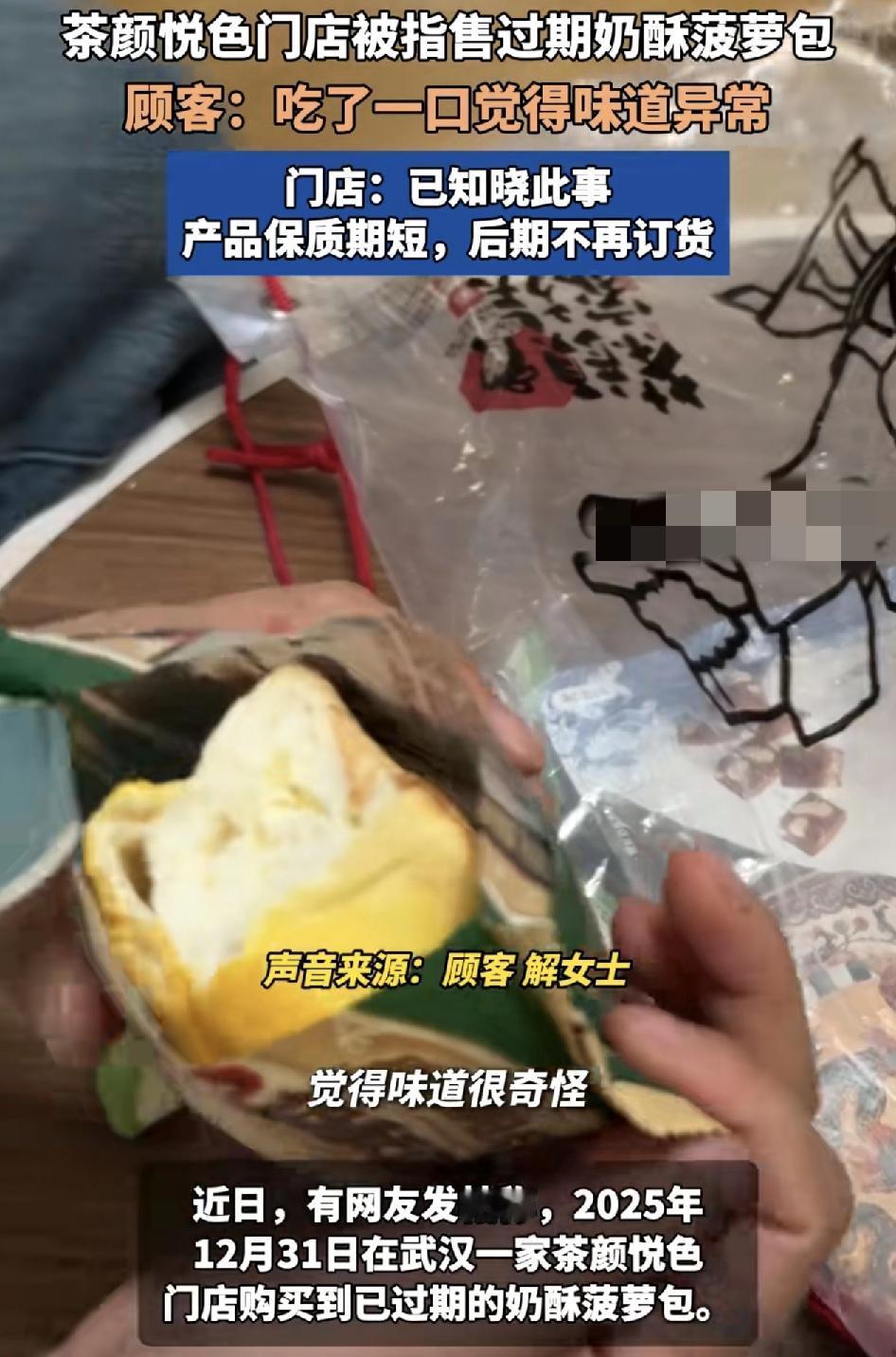 武汉一家荷颜悦色,有顾客反映,买到一款奶酥菠萝包,咬了一口,觉得味道很怪,看了一下配料表和生产日期,已经过期两天了,保质期为三个月,跟门店人员反应的时候,对方核查过进货是没有问题的,反质疑顾客购买的时间。消费者对此很不满,于是向12315投诉荷塘月色总部客服回应称,以后不会再售卖这一款的奶酥菠萝包,因为保期保质期太短,他们也卖不完。网友则表示,这么高价格的茶饮店就这一款面包几个月也售卖不了。