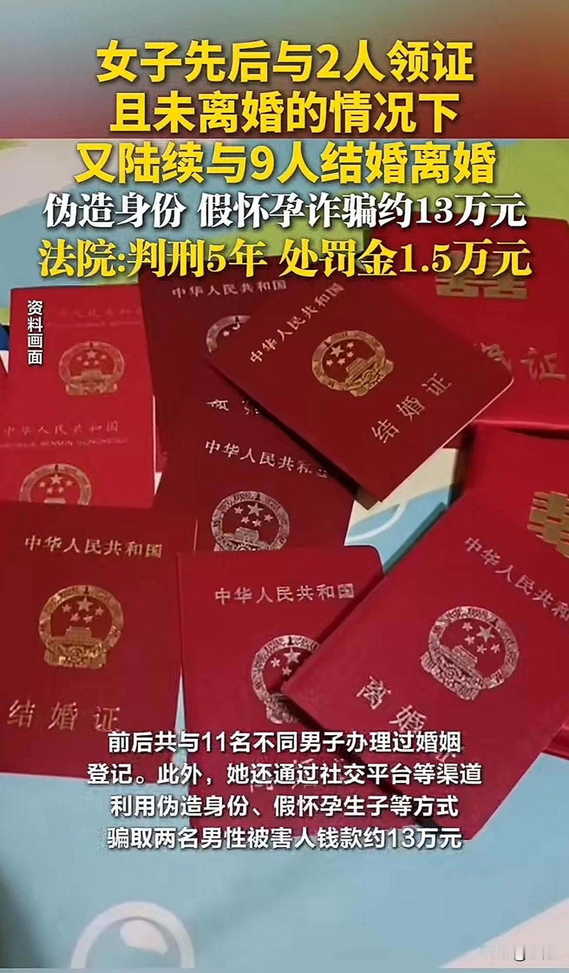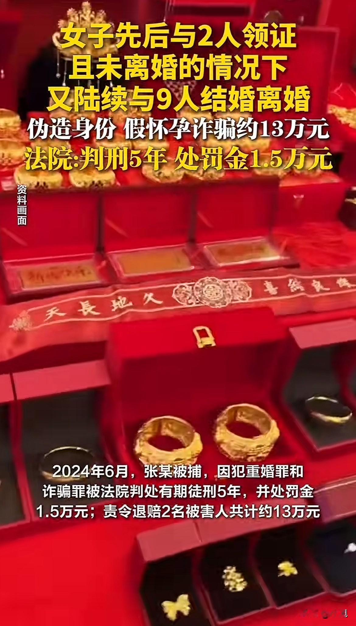 在广西来宾,一个1977年出生的张某,在2000年,她和第一任丈夫关某甲领了结婚证。这没什么,正常的婚姻开始。但两年后的2002年,她又和另一个男人左某甲,再次走进了婚姻登记处。关键是,她和第一任丈夫,根本没离婚。 从这一刻起,事情就滑向了荒唐。她的名下,同时存续着两段合法的婚姻。 但这仅仅是个开始。从2006年10月到2018年,整整十二年里,她像进行某种机械操作一样,又先后与8名男子登记结婚,然后离婚。这还不是终点,2018年6月,她开始了自己的第11段婚姻,嫁给了陈某甲。直到2021年9月,她才通过起诉,结束了这第11次婚姻。 算一算,在法律文书上,她先后与11个不同的男人存在着结婚或离婚的记录。 你可能会震惊,一个人怎么能在婚姻系统里如此“穿梭”?这可能与过去一段时间,部分地区婚姻登记信息没有完全联网有关,留下了可钻的空子。但更核心的是,对她而言,婚姻这张纸,似乎从一开始就不是感情的契约,而后来更变成了一种工具。 当这种“工具”用尽之后,更直接的骗局登场了。 2022年11月,这个有着惊人婚史的女人,经人介绍,成了来宾某村一个叫黄某的男人的女朋友。这次,她连真名都懒得用了,直接用一个虚假身份,和黄某办了一张假结婚证,让他相信,两人已是夫妻。 信任建立之后,收割就开始了。从2024年3月起,张某的“苦难”接踵而至:母亲生病、怀孕需要检查、生下的孩子生病……各种急需用钱的戏码轮番上演。深信不疑的黄某,前前后后给出了10万9千多元。 几乎在同一时期,2023年2月,她在抖音上认识了另一个男人吴某。同样的套路,用虚假身份恋爱,然后以“母亲生病”、“欠债还钱”、“结婚彩礼”、“购买金项链”等理由,骗走了吴某2万多元。 她的目标很明确:那些渴望成家的大龄男青年。她精准地利用了他们对婚姻的期盼,把他们的真诚当成了提款密码。 2024年6月,张某被捕。在法庭上,她试图做最后的辩解。她声称自己实际是1984年出生,早年结婚时未到法定年龄,所以前两次婚姻无效。她还说,吴某送的金戒指、项链是赠与,不是骗。 但法律看的是证据。二审法院的裁定直指核心:除了她自己和家人的说辞,没有任何客观证据能证明她年龄登记有误。更重要的是,法院指出,在交往中隐瞒真实姓名和婚姻状况,这根本不是真诚的恋爱,这就是以结婚为诱饵的诈骗。那些钱,就算部分用途真实,也不是赠与。 2025年12月12日,广西来宾市中级人民法院的裁定下来了:驳回上诉,维持原判。她因犯重婚罪和诈骗罪,数罪并罚,被判有期徒刑五年,并处罚金,同时必须退赔两名被害人将近13万元。 一场持续二十多年,涉及十余次婚姻登记和多次诈骗的闹剧,终于落幕。这件事撕开了一个复杂的剖面:它暴露了过去行政管理中可能存在的技术漏洞,它更残忍地展示了,一个人的贪婪可以如何将人生最神圣的承诺,变成一场反复上演的冰冷交易。 留给那些受害男子的,除了金钱的损失,更有情感上的巨大创伤和信任的崩塌。而法律最终的判决,不仅是对她个人的惩罚,也是对公平正义和社会底线的一次坚定维护。