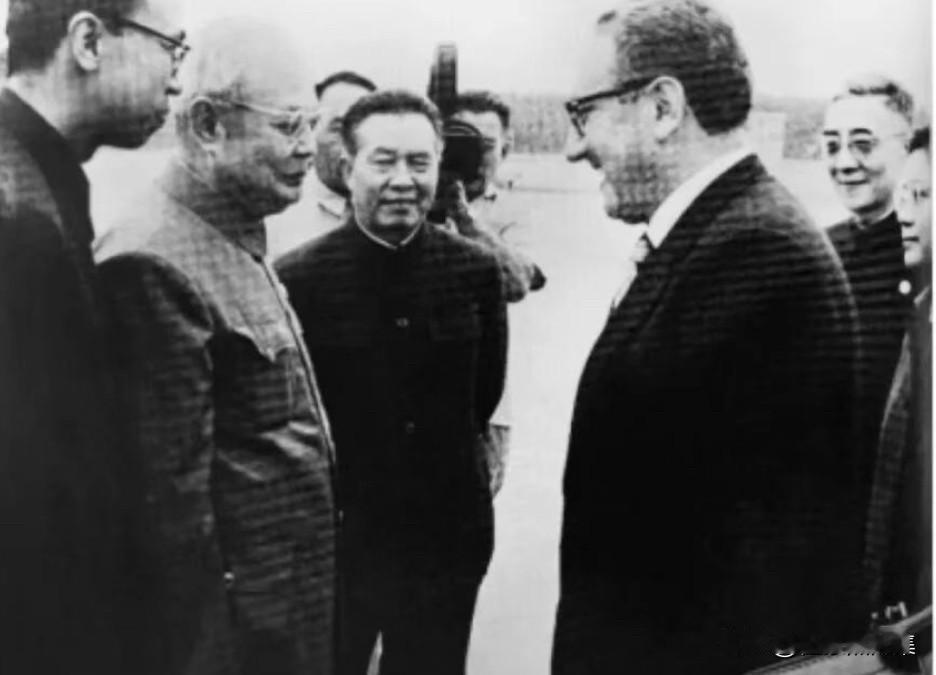 1971年7月9日,美国总统国家安全事务助理基辛格应邀秘密访华抵京,叶剑英到南苑军用机场欢迎。左起为冀朝铸、叶剑英、熊向晖、黄华、摄影师、基辛格、章文晋、唐闻生。这次秘密访问代号“波罗行动”,是中美隔绝22年后首次高层直接接触,直接促成了尼克松访华和中美关系正常化,而黄华作为中方主要接待人员之一。这次访问是完全秘密的,直到7月15日中美双方同时发表公告,世界才知晓基辛格已访华。