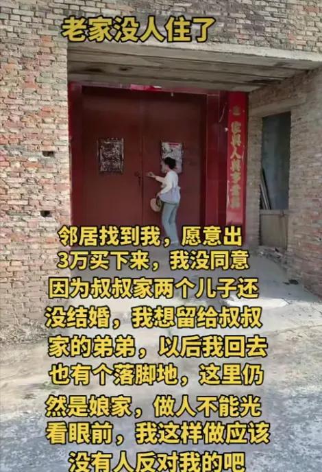 女子是家中独女,父母去世后,老家房子也没人住了。邻居找到女子,愿意出3万买下来,女子做法让人佩服。 女子是家里唯一的孩子,父母走后,老家的那栋瓦房就空了下来,门前的台阶落了灰,院子里的杂草也长了起来。就在她琢磨着该怎么打理这房子时,邻居主动找上了门,开门见山地说愿意出3万块钱把房子买下来,说自己家里人口多,想把这房子翻新后给家里老人住。 面对这送上门的3万块,女子却没有丝毫犹豫地摇了摇头。她跟邻居坦诚解释,自己不是不想卖,而是心里早就有了打算:“我叔叔家有两个儿子,现在都还没结婚,正是需要帮衬的时候。 这房子我想留给叔叔家的弟弟,以后他们结婚或许能派上用场,我回村里也能有个落脚的地方,这里毕竟还是我的娘家。” 这番话没有丝毫拖泥带水,却让不少人觉得暖心又佩服。 之后,女子把自己的纠结和决定发到了网上,想问问大家自己这样做究竟对不对,没想到一下子引发了全网的热烈讨论。 支持女子的网友占了大多数,有人直言“侄子门前站,不是绝户汉”,这句话虽然带着点老辈人的传统观念,却戳中了很多人对亲情的执念。 他们觉得,3万块钱看似实惠,可花完就没了,连点痕迹都留不下,但把房子留给叔叔家的弟弟,这份亲情纽带就永远断不了。以后女子回村里,弟弟家就是她的靠山,叔侄之间互相照应,这份情谊可比冷冰冰的钱珍贵多了。 还有网友分享了身边的例子,说自己也是独生女,父母留下的老房给了表哥,现在每次回村表哥都热情招待,家里有啥事儿也能及时搭把手,那种踏实的归属感是钱买不来的。 也有网友站在现实角度给出了不同看法,觉得从经济角度考虑,卖给邻居其实更划算。 他们算了一笔账,3万块钱对于普通家庭来说不是小数目,能解决不少实际问题,而且老房子长期没人住,容易年久失修,到时候维修还要花钱,反而成了负担。 更有人提到,亲戚之间牵扯到房产很容易产生矛盾,现在看着关系好,万一以后因为房子的归属、翻新等问题闹僵,反而会伤了亲情,不如卖给邻居来得干脆,生意归生意,感情归感情,互不牵扯。 还有网友担心,女子的决定如果没有和自己的配偶商量,可能还会引发家庭矛盾,毕竟按照法律规定,夫妻在婚姻关系存续期间继承所得的财产,通常属于夫妻共同财产,一方不能单方面随意处置。 其实,关于房产继承和处置的纠结,现实中并不少见。有律师就曾解读过类似案例,明确表示如果是法定继承的房产,大概率属于夫妻共同财产,处置时需要征得配偶同意,否则可能导致赠与行为部分无效; 但如果父母生前立有遗嘱,明确房产只归子女个人所有,那子女就拥有完整的处置权。还有不少类似的案例,有的老人感念侄孙多年的悉心照料,会立遗嘱把房产赠与侄孙;也有的家庭因为房产分配问题反目成仇,原本亲密的亲人闹到对簿公堂。 这些案例都说明,房产背后不仅是经济利益,更牵扯着复杂的亲情和法律问题。 女子的纠结,本质上是现实利益与亲情羁绊的碰撞。没有绝对的对与错,不同的选择对应着不同的生活态度。 有人看重眼前的实际收益,有人更珍视长远的亲情联结。而女子的选择,恰恰体现了她对亲情的重视,她守住的不仅是一栋老房子,更是对娘家的眷恋和对亲人的牵挂。 至于网友的不同看法,也只是站在不同角度的建议而已。毕竟日子是自己过的,亲情也是自己维系的,只要女子的决定是经过深思熟虑,并且和家人达成了共识,能够让自己心安,那就是适合她的选择。老房子的去向最终会尘埃落定,但这场讨论让大家明白,在物质越来越丰富的今天,亲情依然是很多人心中最珍贵的财富。