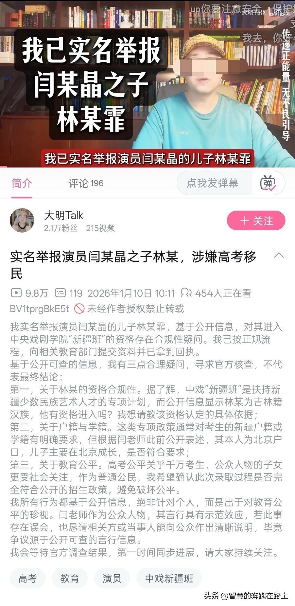 闫学晶之前直播还爆料自己儿子是从新疆班进的中戏,因为新疆班分低。 现在网上有人开始实名举报他的儿子林傲霏。 质疑一个汉族学生,又是在北京生活长大,为什么会有资格进新疆班