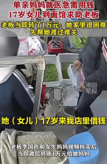 破防了!1月10日,浙江温州,单亲妈妈住院急需押金,17岁女儿跑到面店求助,没想到,热心老板明知还款没把握,还当场转了1万元:先帮她渡过难关!网友:这样的老板必须让他发财! 当天上午9点17分,温州街边这家面馆里,随着手机提示音响起,这笔带着暖意的转账完成了交割,备注栏里只有简短的四个字:“急用,别慌。” 对于日进斗金的大企业来说,1万元或许只是九牛一毛,但对于靠几块钱微利维持生计的小面店而言,这是老板数百个起早贪黑的清晨,亲手揉面、煮面换来的血汗钱。 可转出这笔钱时,店老板李先生没有丝毫迟疑,这不是一时冲动的鲁莽之举,而是一场关于人性的温情接力。 那天清晨的温州格外寒冷,面馆的大门被猛地推开,闯进来的是一位身穿蓝白校服的17岁少女。 虽说是数九寒冬,女孩的额头上却布满细密的冷汗,完全没有普通顾客上门时的轻松。她站在柜台前,双手死死攥着衣角,指节因为用力过度泛出惨白,整个人都透着难以掩饰的慌乱。 这个女孩是大家眼里懂事的“别人家的孩子”,成绩常年稳定在班级前十。可在本该无忧无虑读书的年纪,生活却给了她沉重一击。 她来自单亲家庭,唯一的依靠就是母亲。 可就在前一天,母亲突发急性重病被紧急送医,医生的话如同晴天霹雳:必须立刻手术,否则后果不堪设想。 手术的门槛是1万元住院押金,这对这个本就拮据的家庭来说,不啻为一道天堑。母亲平时靠打散工赚的微薄收入,勉强够维持生计和女儿的学费,根本没有多余的积蓄。 绝望之下,女孩跑遍了所有能想到的亲戚邻居借钱,却依然凑不够缺口。走投无路时,她想起了平时常去的这家面馆。 在老板李先生的记忆里,这个女孩的身影格外深刻。她是店里的常客,却也是最“节省”的食客——每次来都只点最便宜的清汤素面,从来舍不得加一份肉。 李先生早就看在眼里,知道这不是吝啬,而是女孩在默默帮母亲分担生活的重担。 过去这些年,他总会借着资助学费、书本费的名义,小心翼翼地帮衬这个贫寒的家庭,维护着她们的尊严。 此刻,看着女孩颤抖着说出“借钱”二字,眼泪在通红的眼眶里打转却倔强地不肯落下,李先生瞬间就明白了一切。 女孩语无伦次地掏出医院的催款通知,甚至想通过视频让老板看一眼病床上的母亲以证清白,声音里满是随时可能崩溃的哭腔。 她心里很清楚,向一个非亲非故的面馆老板借1万元,风险大到没几个人愿意承担,甚至已经做好了被拒绝、被驱赶的准备。 但李先生的反应出乎所有人的意料。他打断了女孩还在继续解释的话头,既没有要求她打欠条,也没有询问还款日期,只是掏出手机,核对信息后立刻完成了转账。 一句“先救人,其他的以后再说”,简单却有千钧之力。 短短几分钟,1万元救命钱就到了账。看着手机屏幕上的转账金额,这个之前哪怕咬破嘴唇都强忍着泪水的女孩,终于彻底崩溃。 她在面馆狭窄的过道里,对着灶台后忙碌的李先生深深弯下腰,那个鞠躬里甚至带着想要下跪的冲动,这是一个人在绝处逢生时,最真挚也最原始的感激。 旁人得知后难免不解,质疑李先生是不是太傻,万一对方不还钱怎么办? 可李先生的想法简单得令人动容:他救的不是急,是命。 在他看来,用自己几个月的辛苦钱,去换一个家庭重生的希望,值! 他太了解这个女孩了,一个连买瓶水都舍不得的姑娘,若非真的走投无路,绝不会轻易向陌生人开口。这份信任,藏在过去无数次的一面之缘里,也源于他对女孩人品的笃定。 女孩带着钱火速赶回医院,母亲的手术得以顺利安排。在病房里得知真相的母亲,躺在病床上泣不成声,发誓就算打工十年,也要把这笔钱还上。 这1万元,不仅保住了这个家庭的顶梁柱,也守住了少女对这个世界最大的善意预期。 后续没有太多惊天动地的情节,女孩在安顿好母亲后,很快就回到了课堂,没耽误太多课业;面馆也依旧每天清晨准时开张。 只是偶尔,面馆门上会贴出“今日鲜面已售完”的纸条——这是得知此事的邻里街坊,用最朴素的方式表达敬意:主动把生意让给这位善良的老板,帮他填补善举的成本。