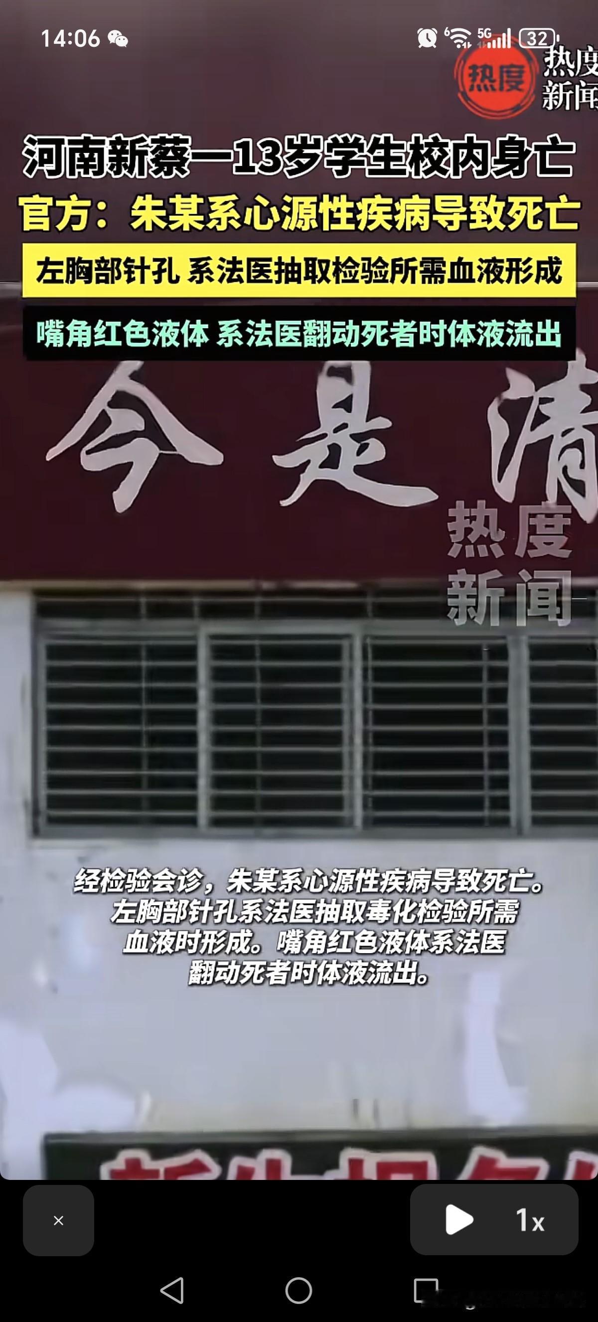 河南新蔡县13岁男孩在学校宿舍离奇死亡事件引起了热议,现在有了最新的进展,左边胸口有针洞 ,嘴角有鲜血都是因为法医造成的。 1月8号6点多钟,河南新蔡县今是清华学校一名13岁的男生在宿舍被人发现死亡,后被传出了疑似转移遗体的事件上了热搜。 加速控诉:孩子父母还没有到达学校,学校就想转移孩子的遗体,学校不让看孩子,也不给说法。后来他们看到孩子之后发现孩子左边的胸部有钉子大小的针孔,而且嘴角有血。 从相关的视频中看到一辆面包车拦在了一辆救护车的前面阻拦救护车运出。 舆论发酵之后,当地教育局回应,学生在校内死亡属实,是否转移尸体的事情公安部门会进一步调查。 再后来,当地对外称,经过公安部门的介入已通过尸表的检查,现场的勘验,监控的调取,病史的查询,已经排除刑事案件。 今天,关于家属提出的伤痕疑点,官方通报再次做出了解释称,该男生在学校没有跟任何人发生冲突,身上也没有伤口,也已经排除了外力受伤,做了毒化检验,排除中毒死亡,孩子的死因是因为心源性猝死,孩子胸口的那个针孔是法医取血化验去检毒时造成的,而嘴角有血是因为法医翻动尸体造成的。 这也难怪父母反应这么大,这个应急处置流程确实有问题啊。 警察没来,家长没到场也没签字同意,法医就来啦?法医就敢自作主张去验尸? 其实发生这类事情,教育部门、学校必须及时、公开、透明,而不是等到舆情发酵再慢悠悠的发出相关的通报。 学校做的最错的事情是没有第一时间通知家长,第一时间报警,第一时间叫120。 事实证明,如果不涉及刑事案件,是学生自身原因导致意外(自杀,者突发疾病),学校遮遮掩掩,反而会引发更大舆情。