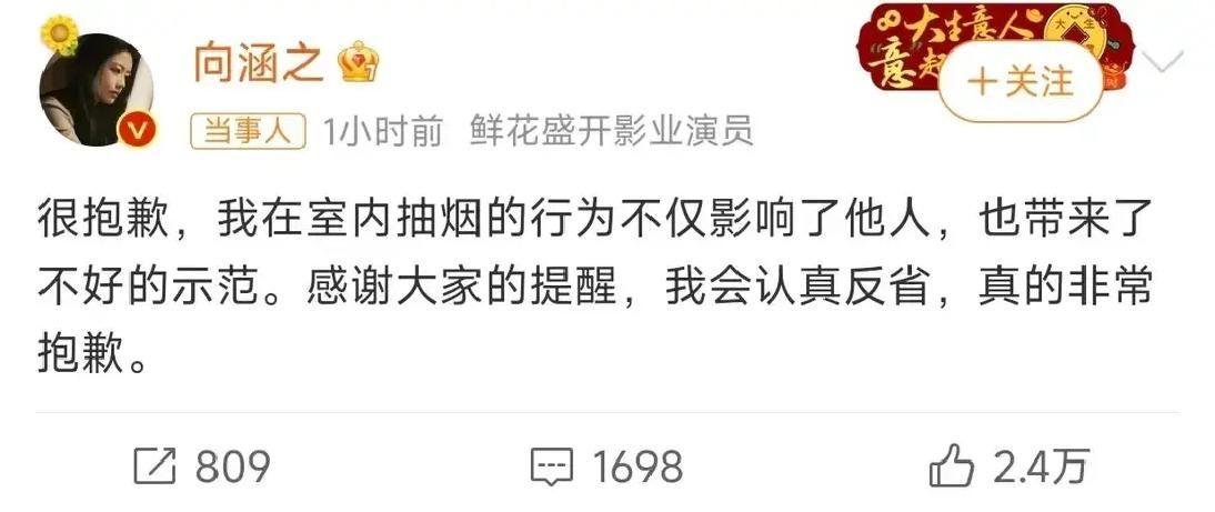 向涵之被拍到当街抽烟,视频一出就冲热搜。 她平时演的是乖乖女,镜头里却叼着烟吞云吐雾,落差太大。 工作室隔天发声明,说行为失当会反省,却只字不提同时传得沸沸扬扬的恋情。 网友分两拨,一边觉得成年人抽烟没啥,一边骂她带坏小孩。 品牌没解约,剧也照常宣传,看样子评估后觉得不算大事。 成年人可以抽烟,公众人物更该想好代价。 道歉只挑轻的说,重的一概不碰,这份聪明观众也看得懂。