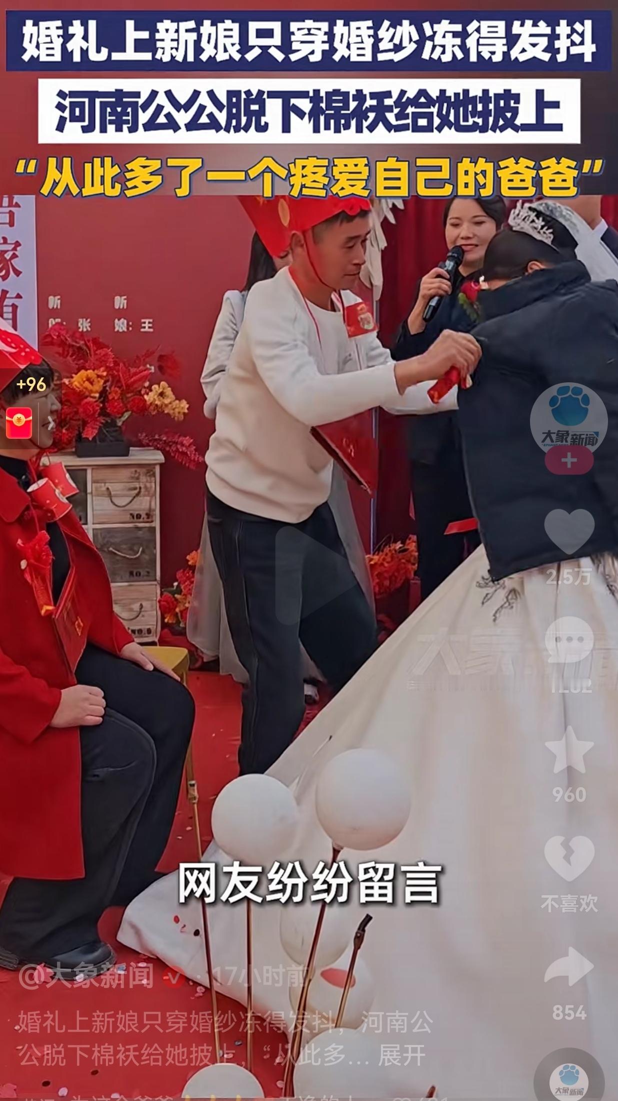太暖心了!近日,河南周口一对新人的婚礼现场,新娘只穿着单薄的婚纱,站在寒风里,冻得瑟瑟发抖,公公很细心,看到儿媳妇很冷。 在敬茶环节,他没有丝毫犹豫,默默站起身,把自己身上棉袄脱了下来,走到新娘身边,小心翼翼地给她披在了新娘的肩上。 就是这么简单的一个动作,没有华丽的言语,却比说多少冠冕堂皇的话,都有分量,更打动人心。 网友看到后评论说:“从此姑娘多了一个疼爱自己的爸爸。” 还有的人说:“太暖心了!这棉袄披上去的那一刻,比多少彩礼都珍贵。因为,他是把新娘当成女儿一样宠爱了。” 说真的,看完这个视频,我心里也暖暖的。 其实,婚姻从来不是两个人的事,而是两个家庭的结合,而这位公公的举动,诠释了什么是真正的家人。 他没有把新娘当成外人,而是像疼女儿一样心疼她的冷,这份朴实的疼爱,比任何甜言蜜语都来得动人。 其实婚姻里最难得的,从来不是多丰厚的物质条件,而是家人之间的这份真心相待。 这位河南公公的棉袄,披在新娘身上,暖的是她的身体,更是她的心房。也让我们明白,好的婚姻,是有人把你放在心上,把你当成家人来疼。 而对于新娘来说,这场婚礼不仅让她收获了爱情,更收获了一份沉甸甸的父爱。希望这对新人在往后的日子里,能带着这份温暖坚强地面对以后的生活。