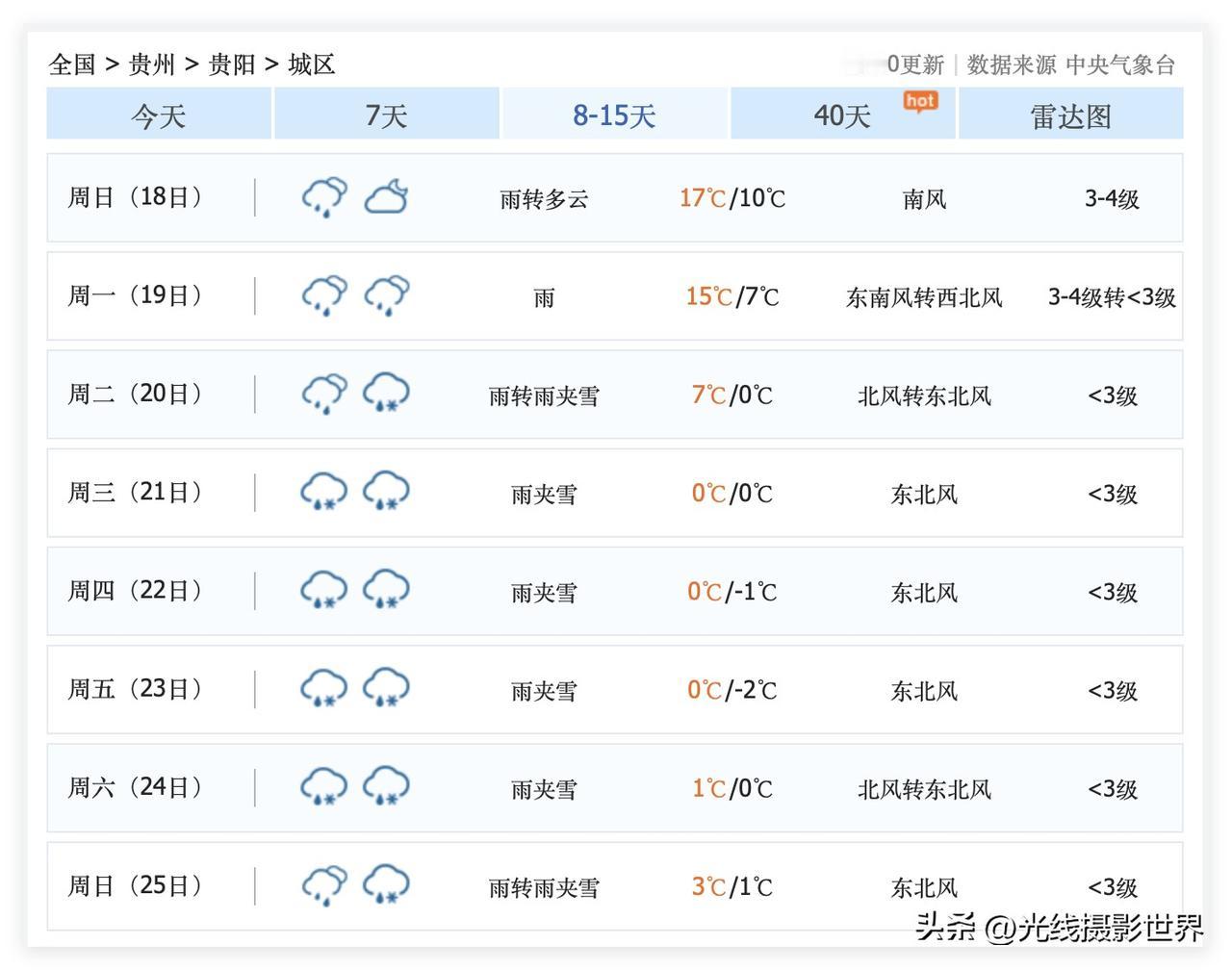 哎!贵州省贵阳市,即将迎来今年冬天最湿冷最难熬的大降温啊!1月20日到25日,贵阳市,几乎每天都是雨夹雪……不排除下雪的可能性……1月23日,贵阳气温跌至0度到-2度……啊啊啊!雨夹雪啊!这样的气温,这样的雨夹雪,这是世界上最冷的天气,到时候,贵阳比北京、哈尔滨还难过,还难熬啊! 好在,1月11日到18日,贵阳市是妥妥的暖冬,最高气温17度……经常有阳光……还好还好,大家好好珍惜吧! 哎呀!