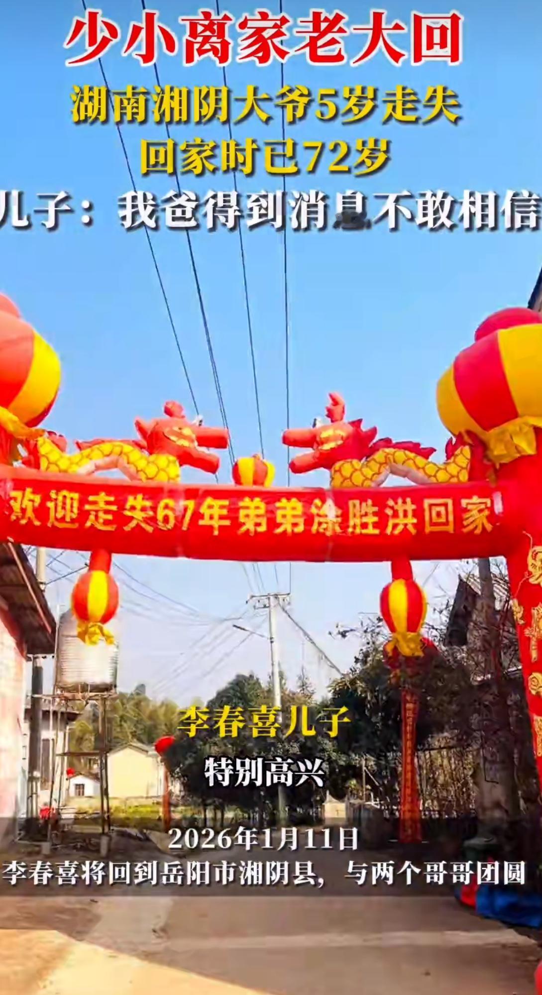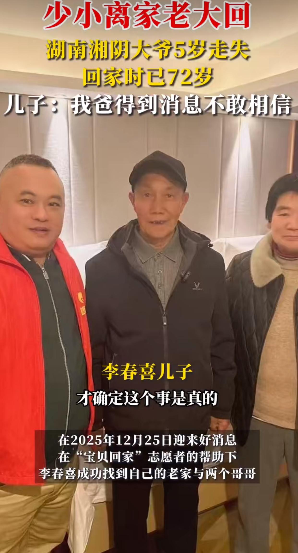 5岁走失72岁回家 这场跨越67年的寻亲终于有了结果! 1959年,5岁的李春喜跟着爸爸坐船走亲戚,在长沙附近走失,被好心人送到福利院后,又被河北邯郸的养父母收养。 此后的六十多年里,他从没停下找老家的脚步。直到2025年12月25日,在“宝贝回家”志愿者的帮助下,李春喜终于找到了湖南湘阴的老家,还有两个哥哥。 如今72岁的他,终于踏上了回家的路,儿子说父亲得知消息时,连自己都不敢相信这是真的。 少小离家老大回,六十多年的思念,终于盼来了团圆。 李春喜67年寻亲回家 宝贝回家志愿者