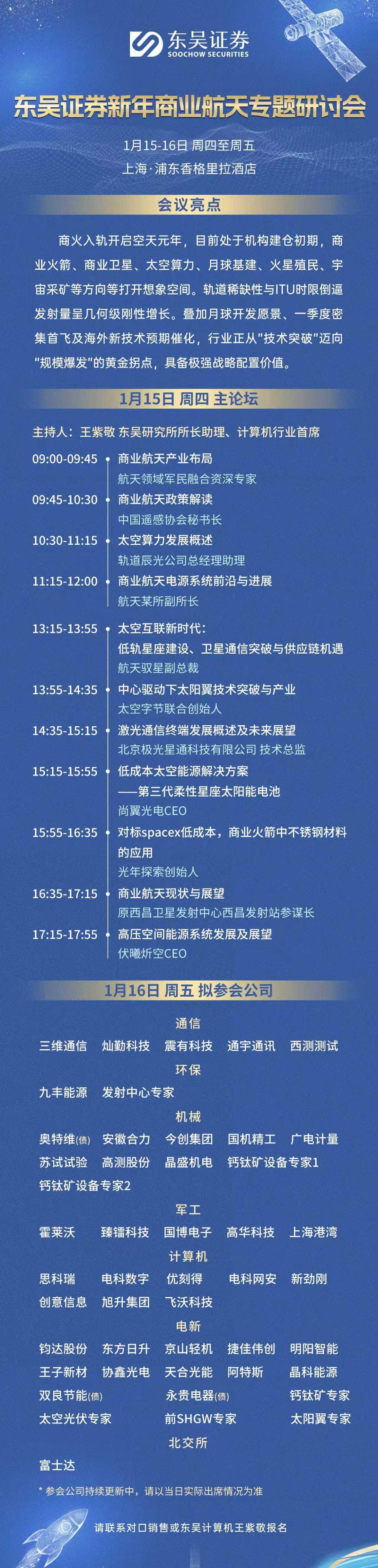 周末重要消息汇总 商业航天: 1、我国新增20万颗卫星申请 专家:这意味着卫星频轨资源申请已上升至国家战略层面 2、星链规模再扩容!美FCC批准SpaceX部署7500颗第二代卫星 3、上海:加速商业火箭等创新产品突破产业规模化发展瓶颈 4、海南商发周末发布官微:火箭回收可期:决胜2026!海上回收系统自航回收船安放龙骨暨现场指挥部揭牌 5、海南商发要求各参建单位要深刻意识到火箭回收系统的国家战略意义 6、国内首款3D打印航空发动机完成飞行试验 7、挑战“首飞即回收”!深蓝航天首款可重复使用运载火箭“星云一号”将于26年春节前后首飞 8、星河动力“谷神星一号”海遥七运载火箭将于1月16日—1月18日择机在日照近海发射 9、下周机构还有很多商业航天专题会议 AI应用: 1、DeepSeek V4爆春节登场!将聚焦编程能力 2、马斯克宣布7天内开源X推荐算法,包括决定用户会看到什么样的自然内容和广告的所有代码 军工: 1、权威央媒周末证实:“南天门计划”正照进现实:十万吨级空天母舰 可搭载88架“玄女”无人空天战机 不仅能在大气层内飞行,还能在大气层外作战 2、美国商务部撤销将中国制造无人机列入所谓“受管制清单”的计划 3、歼10CE首次取得实战战果等入选2025年度国防科技工业十大新闻 机器人: 1、特斯拉“小伙伴”新剑传动,启动上市辅导,利好T链机器人概念。 脑机接口: 1、马斯克:如果能“改写”设定程序 人类可以实现半永生 媒体称“半永生”构想依赖于Neuralink脑机接口完成意识捕捉 2、周五晚间消息,国家药监局公示两项推荐性脑机接口行业标准立项 3、媒体:又一地明确价格!脑机接口收费路径逐渐清晰 有望催化成熟产业链 自动驾驶: 1、加速推动自动驾驶商业化落地,北汽新能源L3车型开启规模化上路通行试点运营 消费: 真金白银促消费、扩投资!国常会部署财政金融协同促内需一揽子政策