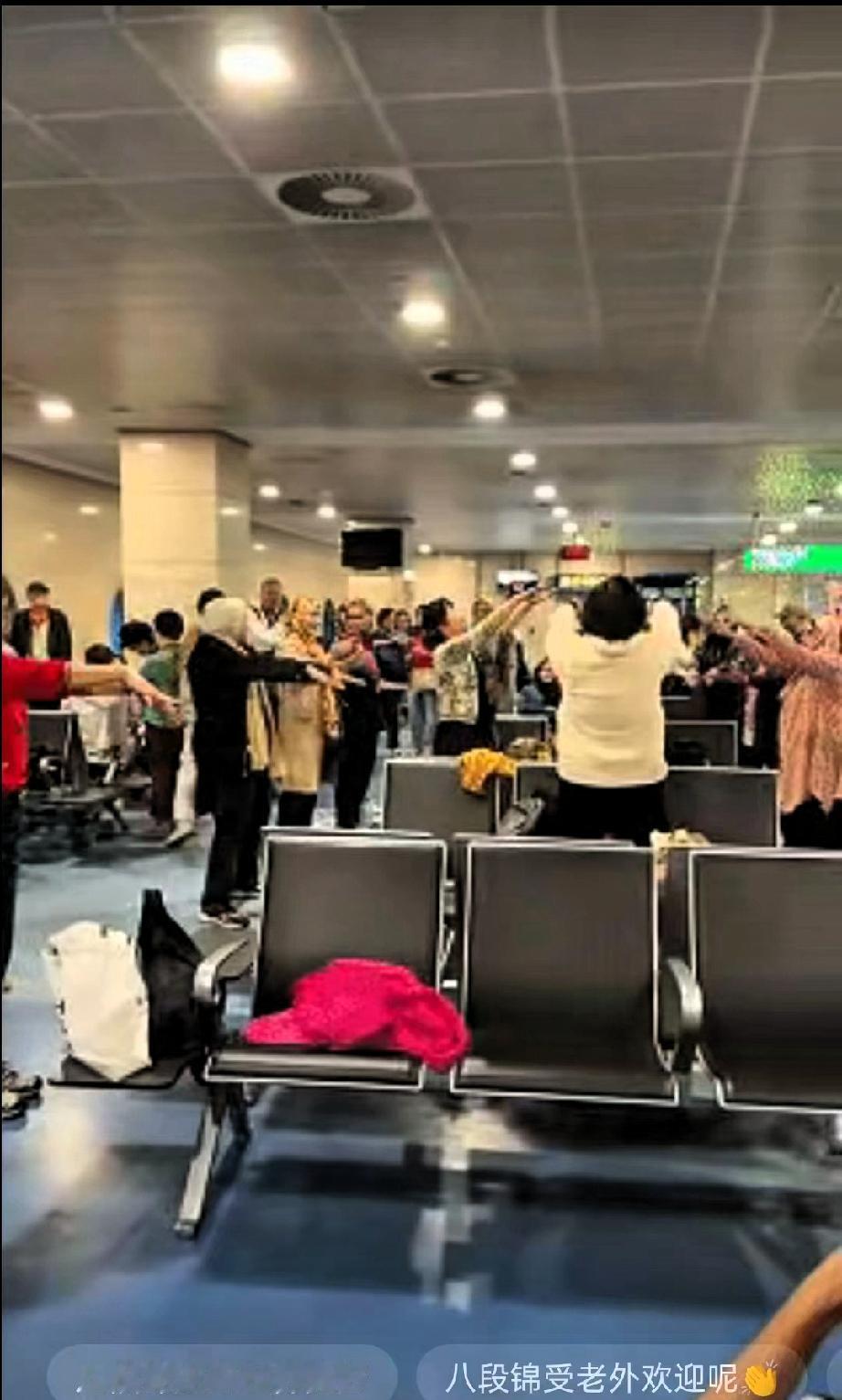 这就是中国文化的魅力!近日埃及开罗机场航班延误,候机大厅里的乘客们大多在默默等候,气氛有些沉闷。 这时,一位中国大妈找了块不影响他人的空地,缓缓练起了八段锦。 她的动作舒缓柔和,一招一式都很到位,抬手、转腰、落脚都透着沉稳的劲儿,很快就吸引了周围外国友人的目光。他们先是站在一旁好奇观望,眼神里满是新鲜,没过多久,就有人忍不住跟着比划起来。 大妈察觉到大家的兴趣,干脆放慢了节奏,还时不时用简单的手势和表情,示意大家注意动作的细节,比如抬手的高度、转身的角度。看到有人动作不到位,她还会走上前,轻轻调整对方的手臂位置。 没一会儿,大妈周围就聚了不少人,有年轻的游客,也有头发花白的老人,大家跟着她一起抬手、弯腰、呼气,虽然动作参差不齐,甚至有些笨拙,但每个人的神情都格外认真。原本略显枯燥的候机时间,因为这场小小的八段锦教学,变得生动起来。 这一幕被同行的中国游客拍下来传到网上,网友们纷纷留言,说这才是最接地气的文化交流。确实,比起刻意的宣传,这种融入日常的分享更有感染力。八段锦不是什么高深的功夫,只是咱们老百姓日常养生的小招式,却能让不同国家的人主动参与进来,这就是传统文化的魅力。 真正的文化自信,从来都不是喊口号,而是像这位大妈一样,从容地把老祖宗的智慧分享出去,让更多人感受到中华文化的温度。