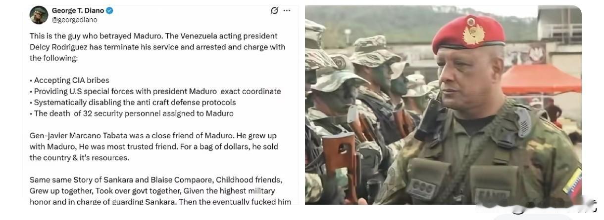 出卖马杜罗的内鬼找到了? ​这就是那个背叛马杜罗的人。哈维尔・马卡诺・塔巴塔将军,委内瑞拉总统荣誉卫队指挥官与军事反情报总局(DGCIM)负责人。 看清楚了!背叛自己国家、出卖自己领导人的人,竟然是掌握军事反情报大权的高级将领!这让人咋舌,但也不难理解。委内瑞拉这场权力博弈,早就埋下了太多“内鬼”的伏笔。而现在,这个消息终于被揭开了。 第一,背叛的理由:从“幕后玩家”到“出卖者” 马卡诺的背叛并不是一时冲动,而是经过深思熟虑的决定。作为负责国家安全与反情报的高级将领,他最清楚局势的紧张和外部势力的压力。西方势力,尤其是美国,已经将马杜罗视为眼中钉,委内瑞拉的国家安全体系早已遭到破坏,政治风暴一触即发。马卡诺的背叛,实际上是出卖了国家和人民的利益,换来了西方的庇护与支持。这个所谓的“忠诚卫士”,最终却成了自己国家的叛徒。 第二,马杜罗的困境:从“全能领袖”到“孤立无援” 马杜罗本以为,掌握了军权和政治权力,他就能牢牢把握委内瑞拉的命运。但外部压力不断增大,内部不满情绪日益蔓延。马卡诺的背叛,只是其中的冰山一角。从经济制裁到国际孤立,马杜罗的领导力早已遭遇严峻挑战。西方国家一直在寻找机会,插手委内瑞拉内政,马卡诺的投敌,无疑让这一切变得更加复杂与危险。 第三,背后操作:谁在拉拢马卡诺? 美国及其盟友自然不会放过这个机会。政治阴谋和经济利益,早已让他们与马卡诺这类“内鬼”达成了某种利益交换。从背叛者的角度来看,这不算什么“忠诚”,而是一场单纯的生死博弈。马卡诺可能认为自己是在“投靠”强者,但他忽视了一个基本事实:西方势力并非信任他,而是利用他。对于他们来说,马杜罗的倒台只是手段之一,而不是最终目的。 第四,教训与启示:国家安全不能放松 这件事给我们的警示非常深刻:国家安全,特别是军事和情报领域的安全,绝不能放松。即便是拥有最高权力的将领,也未必能抵御诱惑或压力的侵蚀。正如我们在台海、东南亚乃至全球局势中所看到的,任何一刻,任何一方都可能在幕后推动复杂的政治交易。我们必须时刻警醒,时刻准备应对来自内外的潜在威胁。 马卡诺的背叛,虽然是个人选择,却反映出一个国家的脆弱。无论你处于多么高的位置,若没有足够的信念和底线,随时可能成为背叛的工具。作为普通人,我们能做的,就是坚守自己的立场,支持国家的强大与统一,确保我们的底线不被轻易跨越。安稳的日子,不是别人给予的,而是我们用实力和智慧捍卫来的。 各位读者,你们怎么看?委内瑞拉的背叛事件,是否能为我们带来启示?欢迎在评论区讨论!
