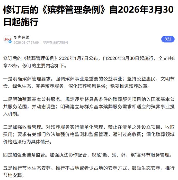 新的殡葬制度将于2026年3月30号执行,大概意思就是:一切从简,城里可以选火葬,山区可以选土葬,但是要进公墓,想搞树葬花葬的国家还给发钱。 这个消息让不少老百姓松了口气,毕竟此前“死不起”的焦虑,一直是很多家庭不愿提及却又不得不面对的难题。 平日里省吃俭用的普通人,一旦碰上家里的“白事”,往往要被各种眼花缭乱的“一条龙”套餐、不明不白的隐形收费折腾得脱层皮,这份沉重的经济和心理压力,终于要随着新制度的落地得到缓解了。 之前就有不少人吐槽,办场白事比娶媳妇还费钱,尤其是医院附近的寿衣店,简直是明着“薅羊毛”。成本一百多块钱的寿衣,换个包装、编个“孝亲尊享”的名头,就能卖到三四千,更有甚者标价上万,不少家属在悲痛情绪里根本没心思比价,只能被店员牵着鼻子买单。 除了寿衣,各种巧立名目的收费更是防不胜防,抬骨灰走几十米要收几百块的“服务费”,撒个花瓣有不同档位的报价,就连遗体存放都能冒出“车辆改装费”“空调使用费”这类莫名其妙的开支,一套流程走下来,少则两三万,多则十几万,把普通家庭的积蓄都要掏空。 这次新制度算是把这些坑都堵上了,核心就是强调殡葬事业的公益属性,以后再也不允许机构借着办白事牟利。 新制度明确列出了基础服务清单,像遗体接运、存放、火化、骨灰寄存这些必选项目都被纳入其中,收费标准由政府统一制定并公示,不存在暗箱操作的空间。 更关键的是,以后新开的殡葬服务机构都得是政府主导的非营利性的,不准再搞营利性的赚黑心钱,这就从根源上掐断了天价收费的利益链。 在安葬方式上,新制度也充分考虑了不同地区的实际情况,没有搞“一刀切”的强制要求。城里的居民还是以火葬为主,毕竟节约土地还环保,相关的火化设备也会更新升级,确保符合环保标准。 而山区居民因为地理条件限制,可以选择土葬,但必须进入政府规划的公益性公墓,不能再像以前那样随便在耕地、林地或者公路边建坟,既保护了土地资源,也避免了乱埋乱葬带来的纠纷。 更贴心的是,国家还鼓励大家选择更环保的树葬、花葬,要是选了这些生态安葬方式,还能拿到真金白银的补贴。 这笔钱虽然不算特别多,但足够覆盖基本的安葬开支,也能让更多人愿意主动接受生态安葬的理念,毕竟既省钱又能为环保出份力,何乐而不为。 针对农村地区的殡葬问题,新制度也有专门的安排。村里可以利用集体土地建公益性墓地,而且原则上不能向村民收取墓位使用费,政府还会承担一部分建设和管理费用。这就解决了农村老人“身后事”的后顾之忧,不用再担心因为没钱进不了公墓。 同时,新制度也明确禁止建宗族墓地,还有那些在耕地、水库周边、铁路公路主干线两侧的现有坟墓,除了有历史价值的,都要逐步迁移或深埋,不留坟头,既规范了安葬秩序,也保护了生态环境。 为了确保这些政策能落到实处,多个部门还会联手监管。市场监管部门会重点查处价格违法、违规收费的行为,要是再有人敢搞隐形收费、强制捆绑消费,一经举报核实就会严肃处罚,最高能罚一百万。民政部门也会建立殡葬服务信息系统,把所有服务机构和从业人员都纳入管理,还会公开投诉举报渠道,让老百姓遇到问题能及时维权。医疗卫生机构的太平间也不能再外包搞殡仪服务,避免了之前医院和殡葬机构勾结牟利的情况。 其实老百姓对殡葬的要求很简单,就是体面、省心、不花冤枉钱。以前的殡葬乱象,本质上是公益属性的缺失让逐利行为有了可乘之机。这次新制度从明确公益属性、规范收费标准、优化安葬方式到强化监管处罚,每一条都戳中了老百姓的痛点。 等到2026年3月30日正式执行后,“死不起”的焦虑应该会彻底成为过去,大家不用再为身后事的花销犯愁,也能让逝者走得更安详,让生者少些奔波和负担,这种接地气的政策,才是真正为老百姓办实事的好政策。