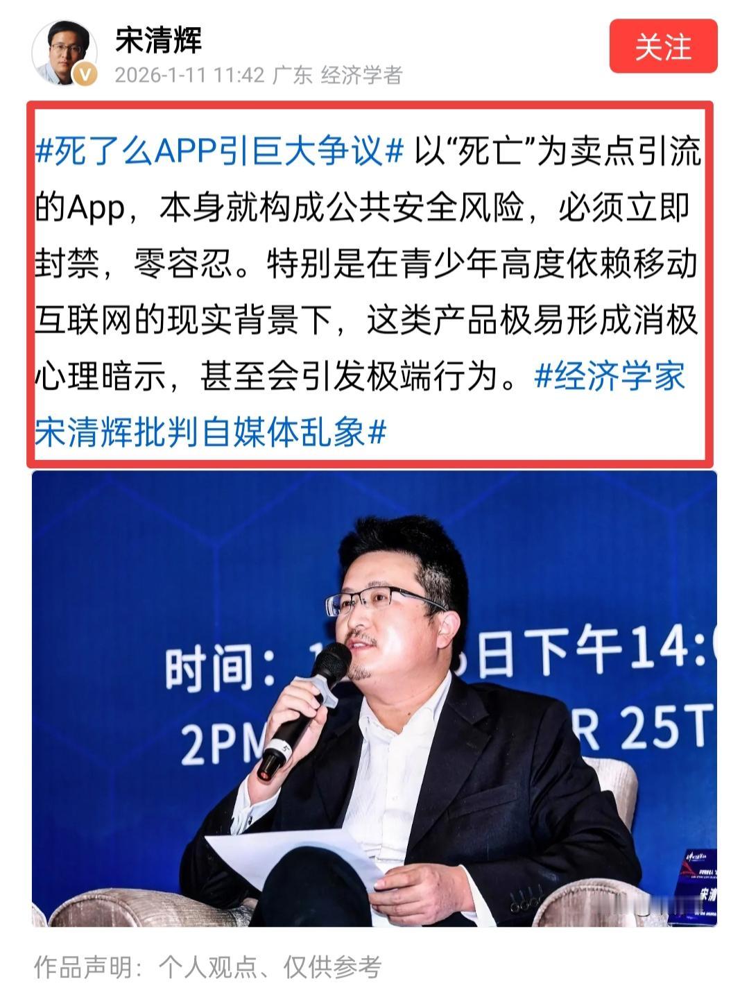 关于“死了么”APP,胡锡进与宋清辉各有观点。 胡锡进先生认为,“死了么”APP有其价值,能为部分孤独老人提供帮助、给予心理安慰,但他建议修改该软件的名称。对此,经济学者宋清辉则提出,这类产品的名称带有消极心理暗示,对青少年不利,建议对其进行封禁下架。 暂且不论该产品的功能,单从胡锡进与宋清辉的观点来看,我们能明显发现这款APP的名字确实不够恰当,且容易给人带来负面心理诱导,整体导向较为消极。因此,胡锡进提出的改名建议具有较高参考价值;同时,宋清辉的意见也应得到重视。毕竟这类软件目前缺乏使用门槛,一些青少年可能会因好奇下载使用。这类名字本身带有消极属性,若让青少年参与其中,确实存在不妥。 综上所述,这款软件不仅需要修改名称,还应在注册环节设置一定门槛,例如通过年龄限制来避免年轻人注册使用。因为这款软件的设计初衷,本就是关注老年人的心理需求与安全需求。