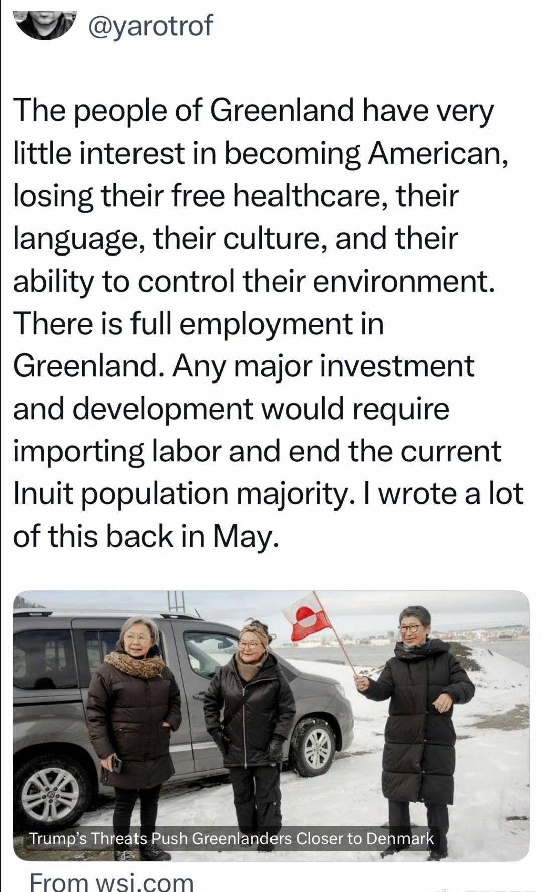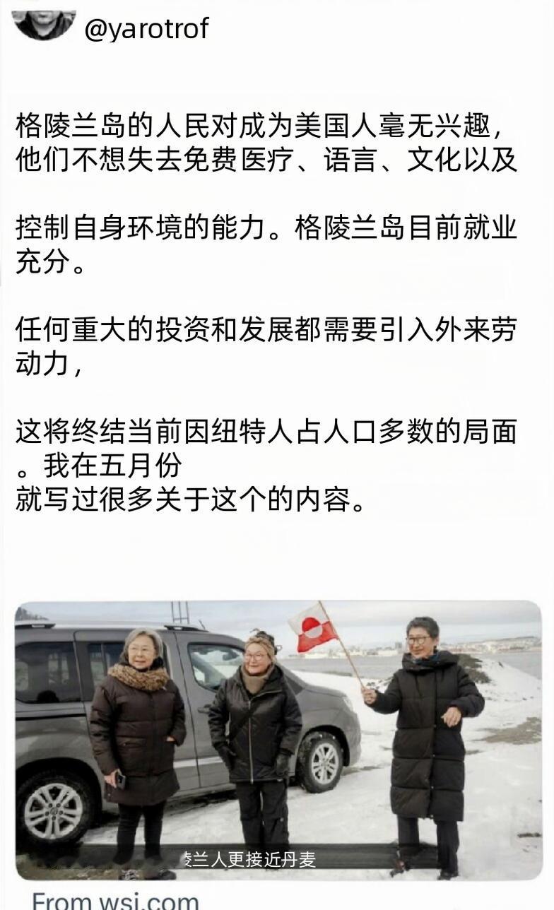格陵兰岛88%的原住民,因纽特人(又称爱斯基摩人),普遍长着黄皮肤、黑头发、黑眼睛,典型的东亚人特征,看着好亲切啊。 据说爱斯基摩人祖先约在5000-10000年前从亚洲东北部经白令海峡迁徙至美洲,最终扩散至格陵兰岛。部分自媒体称其为中国商朝或战国齐人后裔。 网友给出的其中一个理由就是“爱斯基摩人”和“俺是即墨人”谐音。即墨,山东青岛。 格陵兰只有5.7万人,生育并不高。20世纪60年代,丹麦曾强制格陵兰岛女性节育,对原住民女性秘密植入宫内节育器,最小的约仅12岁。2025年丹麦首相才道歉。 特郎普对格陵兰岛势在必行。2025年丹麦刚和美国签署协议,赋予美军自由驻扎权及治外法权。但特郎普不满足于此,他想得到格陵兰岛上的稀土和在北极圈支起导弹支架和防御系统,到时指哪打哪。美军在岛上有一支驻军。 格陵兰民调,有85%的人反对成为美国的一部分,只有6%的人愿意成为美国的一部分。 丹麦、欧洲是挡不住特郎普的。 特郎普最近很忙,有三个目标: 1,打击墨西哥贩毒集团,已在开始侦查了。 2,趁伊朗内乱,军事打击伊朗。 3,强买或强抢格陵兰岛。 对我们影响最大的可能就是美国控制格陵兰岛。毕竟,那地儿,处在三个大国头顶的中间位置,去哪都方便。