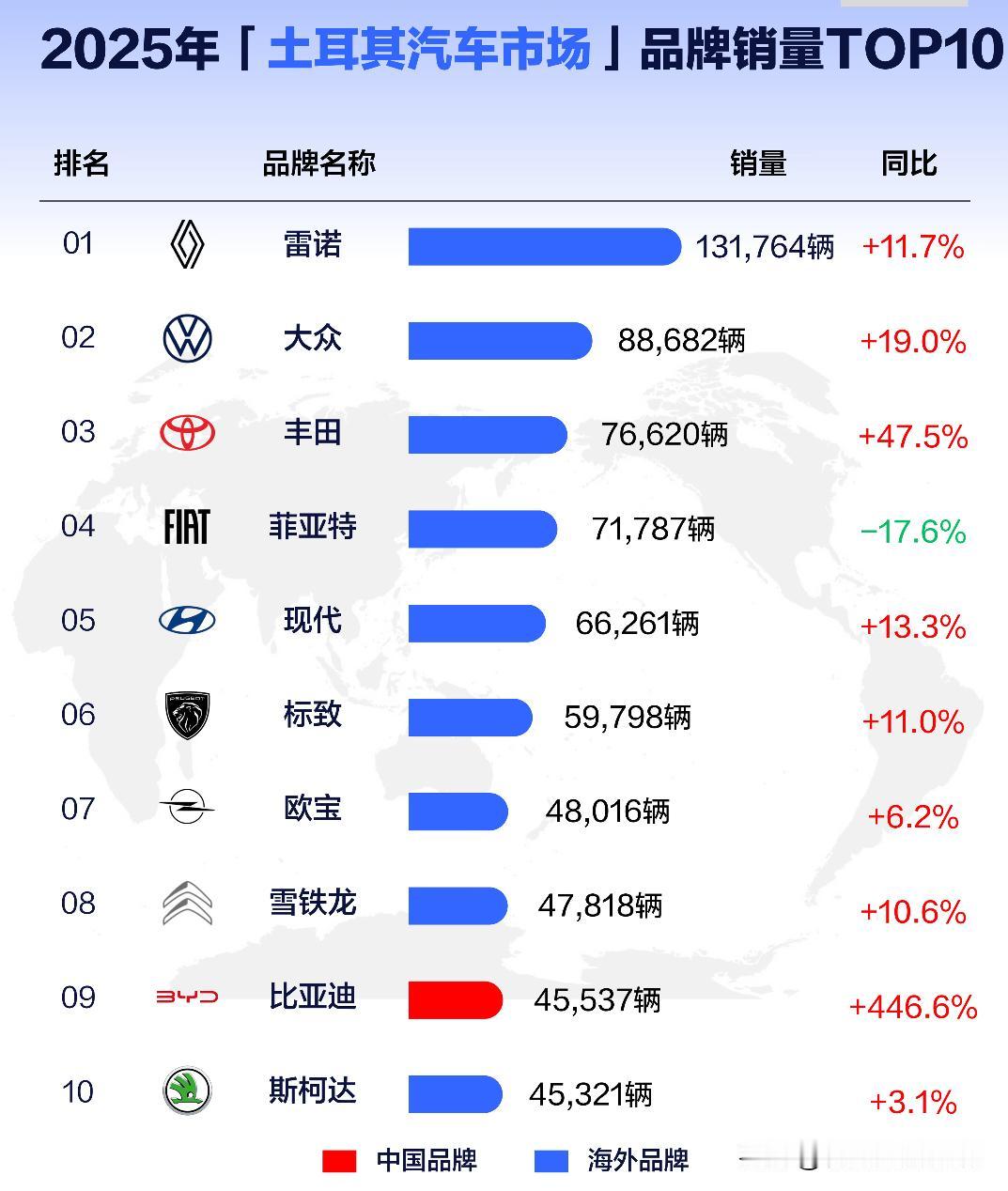 雷诺,菲亚特,标致雪铁龙在中国汽车市场卖的不咋样,在土耳其却位居前列。 2025年12月&年度土耳其市场品牌销量TOP10 根据易车基于土耳其官方机构/汽车协会数据整理显示: 12月品牌销量前3名分别为:雷诺、大众、丰田,销量分别为:21935辆、14135辆、9336辆 2025年年度品牌销量前3名分别为:雷诺、大众、丰田,销量分别为:131764辆、88682辆、76620辆