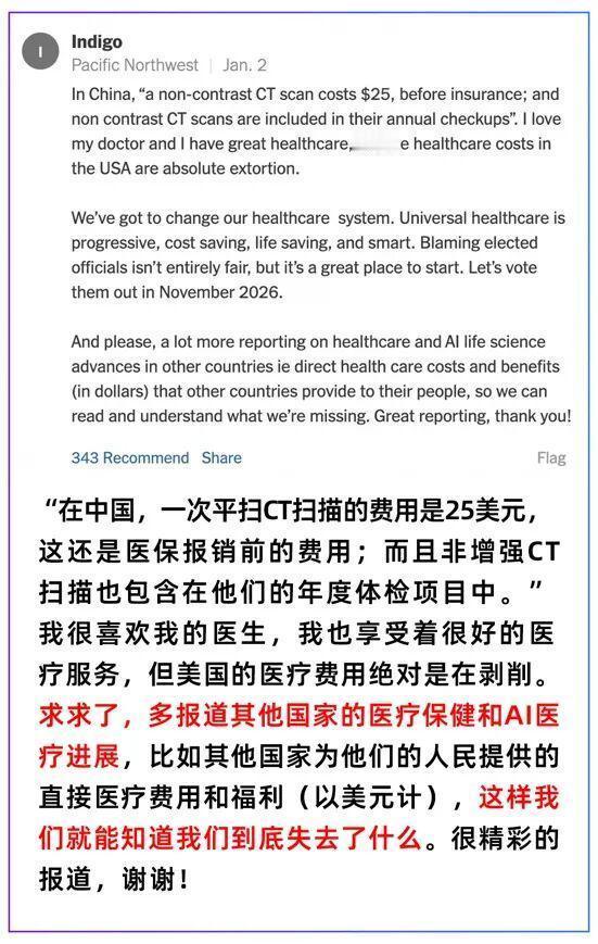 纽约时报的评论区炸锅了!老外集体破防:在中国做一次CT只要25美元?‘’ 你敢信?2026年刚开年,这家逢中必反的西方大报,竟然腾出整版位置,发了篇正面报道,《在中国,AI正在发现医生可能漏掉的致命肿瘤》。 2026年刚开头,美国《纽约时报》的评论区就被一条来自中国的医疗消息给刷爆了。 让美国网友们吵得不可开交的,不是什么国际上的大纷争,而是这家平时总对中国带着有色眼镜的报社,居然拿出一整个版面,发了篇夸中国的报道。 讲的是中国用人工智能,帮医生找出了那些差点被忽略的致命胰腺癌。 报道里有个细节,直接让美国人坐不住了,在中国做一次带AI癌症筛查的平扫CT,医保还没报销呢,也才25美元,而且这种检查,早就包含在普通人的年度体检项目里了。 有美国网友简单算了下,25美元在美国的医院里,最多也就够停几个小时的车,想靠这点钱做一次基础的CT检查,根本就是天方夜谭。 他们太清楚自己国家医疗费用有多离谱了,不少人都在评论区晒出自己的经历。 有人做一次类似的检查,花了上千美元,还有人吐槽,就算是个小毛病,看完病的账单都能让普通家庭扛不住。 之前有个叫王伟恒的华人,在美国就看了个腰疼,前后也就15分钟,最后收到的账单居然有5600美元。 进一步对比之后差别就更明显了,中国25美元的CT,不光能查基础病症,还能靠AI精准找出早期胰腺癌,这样的差距,让很多美国网友直呼“想都不敢想”。 报道里那个被AI救了一命的浙江宁波退休泥瓦匠邱先生,就是最真实的写照。 邱先生当时就是去医院做糖尿病的常规复查,没想到三天后,医院就打来了电话,说AI在他的CT片子里,发现了胰腺癌的早期症状。 好在发现得早,手术做得很顺利,现在邱先生已经痊愈回家了。 不少美国网友看完邱先生的故事,除了羡慕中国医疗费用的亲民,还对背后的AI技术产生了浓厚的兴趣。 这款帮上大忙的AI是阿里巴巴达摩院研发出来的,专门负责在非增强CT片子里找早期胰腺癌的痕迹。 从2014年11月开始,它就在宁波的这家医院被使用,成功找出了14例早期胰腺癌患者。这也就意味着,这些患者都得到了治愈的希望。 有美国网友特别意外:阿里巴巴明明是做电商的公司,居然会投入精力去研发对抗胰腺癌的技术。 他们忍不住对比自家的情况:美国的科技巨头,大多把AI用在替代工人岗位、开发虚拟产品这些能快速盈利的事情上,很少有这种直接帮普通人解决健康难题的技术真正落地。 更让美国人感慨的是,这种普通人都能享受到的亲民医疗服务,背后其实是两种医疗体系的差异。 中国的医疗体系一直围着“普惠”这个核心转,政府会通过医保调控、集中采购等办法压低成本,把基础医疗服务的价格控制在普通人能承担的范围里。 可美国的医疗体系是高度市场化的,医院、制药公司、保险公司缠成了复杂的利益链条,每个环节都要从中赚钱,最后所有的成本都得由患者来承担。 这也就不难理解,为什么会出现“看个腰疼花几千美元”这种离谱的事情了。 就连美国医疗界也认可这项中国技术的价值。 美国食品药品监督管理局早在去年4月,就给这款AI颁发了“突破性医疗器械”资格,还特意加快了审评流程,就想让美国患者能早点用上这个好东西。 那些有亲朋好友被胰腺癌夺走生命的美国民众,更是在评论区掏心窝子地留言,盼着能早点用上这项中国技术,还特意给中国的研发人员加油,让他们坚持做下去。 还有网友直接呼吁《纽约时报》多做些类似的报道,把其他国家的医疗费用、民生福利都换算成美元讲给美国人听,让大家清楚自己到底少享受到了什么。 一则关于中国AI医疗的报道,最后居然引发了美国人对自家医疗费用的集体反思。 说到底,大家真正关心的从来不是某项技术多先进,而是这项技术能不能真的帮到普通人,能不能让大家花得起钱、看得好病。