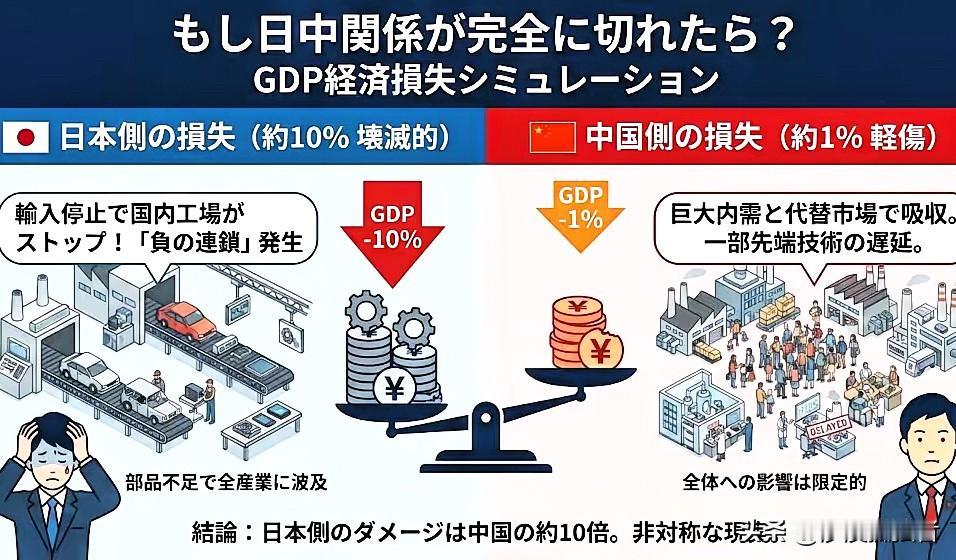 要是中日直接贸易停止了会咋样? 日本用超级计算机进行试算,日本会损失GDP的10%,经济崩溃。 中国损失大概1%,轻伤。 前日本朝日电视台记者玉川彻表示:中国不管是进口还是出口,和日本相关的贸易只占总贸易的 5%,这比例小到几乎不影响大局。 可日本就完全不一样了,卖给中国的东西占它总出口的 17.6%,从中国买的东西更是占到总进口的 22.5%,相当于日本经济的五分之一都绑在中国身上,这么深的依赖度,一旦断了贸易,可不就是灭顶之灾。 咱先掰扯掰扯这几个数字,可不是纸上谈兵的虚数,是真真切切能砸了日本饭碗的实锤。就说日本最引以为傲的汽车产业,中国可是它最大的海外市场,2024年日本对华汽车出口额占了其汽车出口总额的28%,丰田、本田这些车企在华销量更是占了全球的三成以上。 要是贸易一断,这些车卖不出去,丰田光在华的120万辆产能就得闲置,近10万工人要失业,连带着上下游的零部件供应商也得跟着倒闭,这可不是小事,是直接戳了日本制造业的脊梁骨。 还有半导体这块,日本总觉得自己卡着中国的脖子,可实际上东京电子的精密机床对华出口占比35%,信越化学的硅晶圆也靠中国市场撑着,去年跟着美国搞制裁后,东京电子营收直接跌了36%,信越化学的生产线停工率达25%,4900亿日元的市值说没就没。 更别提日本90%的稀土都从中国进口,这可是半导体、新能源汽车的命根子,中国这边稍微收紧管制,日本的工厂就得喊停,丰田去年就因为稀土供应问题减产8%,损失1400亿日元。 反观中国,5%的贸易占比真就是九牛一毛。日本的光刻胶咱确实进口不少,可现在南大光电、鼎龙科技的国产光刻胶已经能供货,河钢的高强镀锌产品也替代了日本进口的汽车材料;液化天然气以前从日本那边拿的,现在直接从澳大利亚进口,还成了澳洲最大的买家。就算少了日本的货,咱转头找东南亚、欧洲的供应商,分分钟就能补上,根本不会卡脖子。 日本有些政客总跟着美国瞎起哄,想着搞对华制裁,可他们压根没算明白账,日本经济的五分之一绑在中国身上,这不是说说而已。 真要是断了贸易,中国不过是轻伤,日本却是实打实的经济崩溃,这就叫搬起石头砸自己的脚。玉川彻的话其实点透了,G7里喊得再凶,真到了动真格的时候,谁都知道中国不好惹,更知道跟中国断贸,倒霉的只会是自己。 史料出处:中日贸易占比及日本GDP损失数据来源于日本经济产业省试算报告、玉川彻公开表态;日本汽车产业对华依赖数据来源于理想国307、第一财经报道;日本半导体产业损失及稀土依赖数据来源于文史旺旺、网易新闻报道;中国替代进口产品相关信息来源于国家发展和改革委员会、中国钢铁新闻网报道。 各位读者你们怎么看?欢迎在评论区讨论。