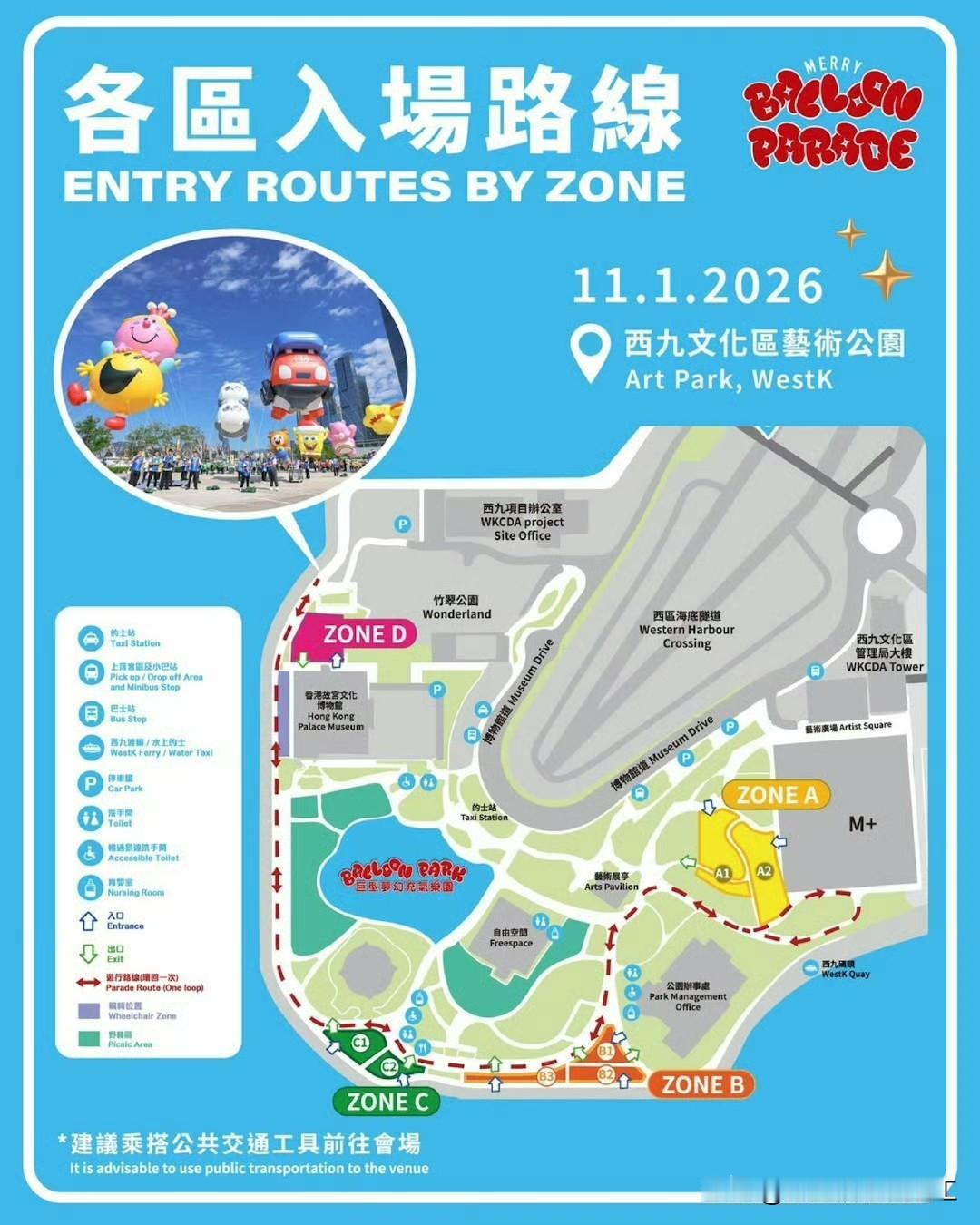 香港首个大型人气IP角色气球巡游「Merry Balloon Parade」将于今日在西九文化区艺术公园展出。 巡游角色IP出场次序: 1. Logo Stars 2. LuLu 猪(LuLu the Piggy) 3. 奇先生妙小姐(MR. MEN LITTLE MISS) 4. 姆明(Moomin) 5. 海绵宝宝(SpongeBob SquarePants) 6. 汪汪队立大功(PAW Patrol) 7. 加菲猫(Garfield) 8. M&M' S 9. CoComelon 10. 小王子(The Little Prince) 11. 爱心小熊(Care Bears) 12. 香港重机(Hong Kong Machines) 13. 薯蛋头(Mr. Potato Head) 14. Peppa Pig 15. 海洋公园 Panda Friends(Ocean Park Panda Friends) 16. 灿子(SHO-CHAN)
