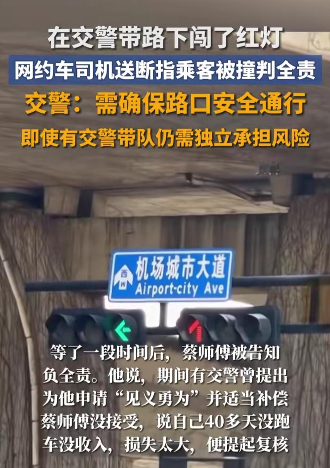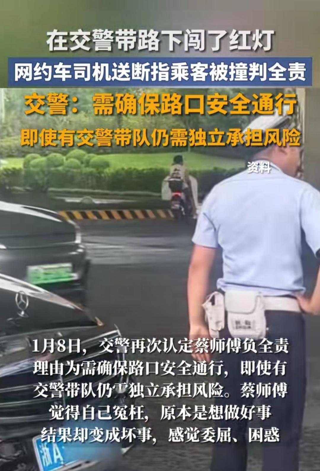 乘客断指鲜血直流,网约车师傅跟着交警开道闯红灯,结果撞车被判全责,修车费4万+、停运40多天还得涨保费!这事看得人心里五味杂陈,善意和规则的碰撞,到底该怎么选? 数月前的杭州街头,蔡师傅接单后发现乘客断指装在塑料袋里,血流不止。情急之下求助执勤交警,交警拍下车牌后喊他“跟牢我”,骑着摩托开道闯了红灯。可刚到路口中央,就被一辆正常行驶的私家车撞上。 后续认定让蔡师傅懵了:初次判定全责后,他申请复核,结果1月8日收到的二次认定还是全责,理由是“需确保安全通行”。网友吵翻了:有人说寒了好人的心,有人说规则不能破。蔡师傅没抱怨,只说换谁都会救急,可下次再遇到这事,还能义无反顾吗? 一边是人命关天的紧急救援,一边是不能逾越的交通规则,你觉得这次的责任判定合理吗?如果是你,会怎么选?