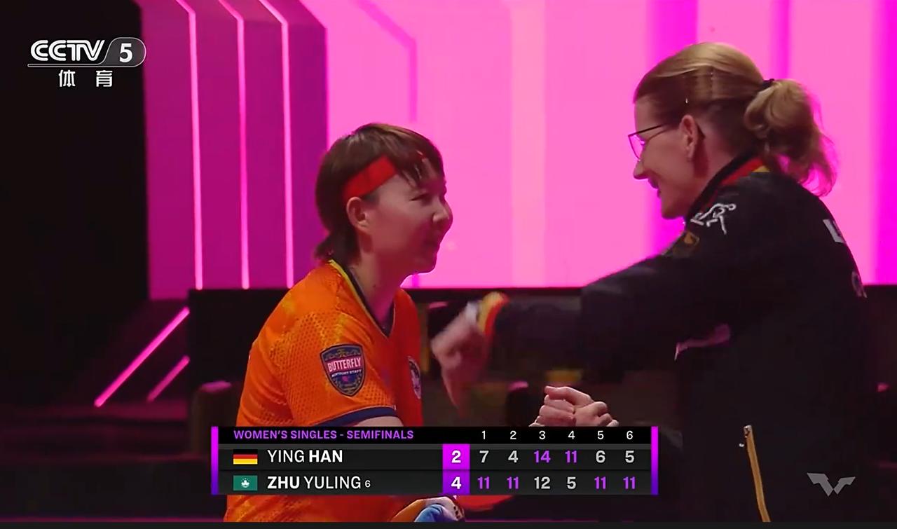 致敬老将!英雄惜英雄,当最后一球落地时,两人深情相拥。 朱雨玲去年仁川冠军赛打进四强,而韩莹是头一回在冠军系列赛中打进半决赛,两人都想在今天比赛中突破自己,这就赋予了这场体能消耗大战特殊的意义! 朱雨玲的厉害之处,在于她对旋转的理解很到位,她参透了韩莹的反手长胶特点——来球弧线低沉,而且其反手弹击技术很有威胁,所以她在开始时重点压住对方的反手位,在耐心铺垫数拍后突然爆冲正手,这是她能取得两局领先的原因(图2、3)。 比赛最精彩的是第3局,落后两局的韩莹无路可退,主动进攻,打得十分顽强,在10-10时,双方的比分交替上升,韩莹3次拿到局点,最终14-12扳回一局。这一局后,韩莹的主动失误大幅减少,朱雨玲正手出现失误后只能加保险,爆冲弧线上升,质量下降,韩莹抓住机会强势进攻,11-5再胜,此时朱雨玲的心态开始出现动摇!2-2,双方回到同一起跑线。 这就是高手之间的较量:韩莹进攻手感的增强,给了朱雨玲很大的压力,对其正手进攻的落点、线路和耐心的要求更高了,所以此时两人的比拼已经超越了技术,还有很大一部分是心态! 第五局,朱雨玲的吼叫声开始响起来了,确实很难,11-6,韩莹太难缠了,朱雨玲每拿一分,都要付出很多体力的代价! 打削球就像跑长跑,你会很累,要耐得住性子,要不断调整! 当第六局7-4时,朱雨玲连续吼叫起来,她的控制题很有效,没有给韩莹太多的制造旋转的空间,一个漂亮的吸短,10-5,赛点出现,然后,一个潇洒的倒地正手爆冲取得比赛胜利。 朱雨玲的获胜不仅是她对自己的突破,而且给国乒提供了打削球的重要参考,控制落点,观察对手旋转的变化,多变化,总之就是要让对方难受,瞅准机会下杀板,不能一根筋打到底!还有一点,要死死咬住比分,一旦被削球手拉开距离,确实心态会更急,很难追回来! 祝贺朱雨玲,不管她能否夺冠,今天的精彩表现,足以让人肃然起敬!!为小猪点赞!!